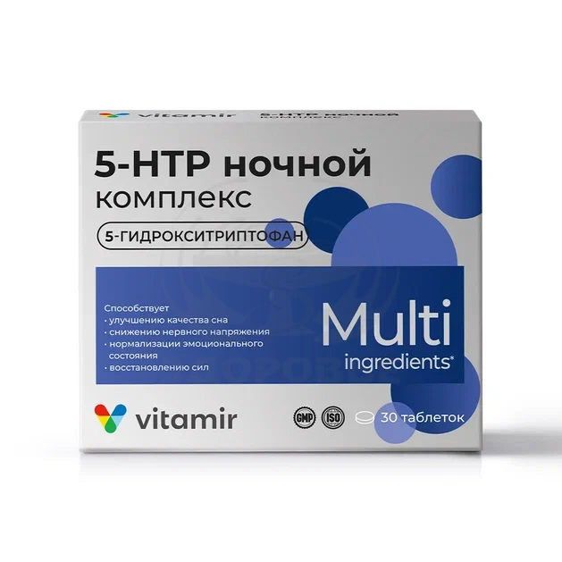 Экстракт Гриффонии (5-гидрокситриптофан; 5-НТР), магния гидроксид, экстракт корня валерианы, пиридоксина гидрохлорид (витамин В6).