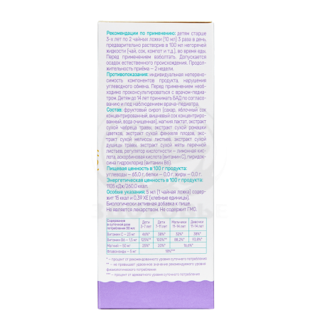 Магния лактат, витамин В6, экстракт сухой чабреца травы, экстракт сухой ромашки цветков, экстракт сухой фенхеля плодов, экстракт сухой мелиссы листьев, экстракт сухой душицы травы, экстракт сухой мяты перечной листьев, витамин С, фруктовый сироп (сахар, яблочно-вишневый сок).