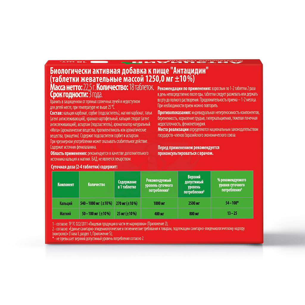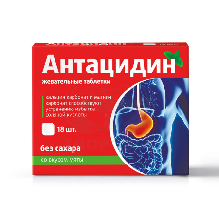 Антацидин - Биологически активная добавка (БАД) к пище«Антацидин» (от лат. anti - против и acidum - кислота) - продукт, способствующий облегчению чувства дискомфорта в желудке.Плотная трапеза, курение, употребление определенных продуктов (сладости, кофе, томаты, цитрусовые, пряная или острая пища и драже), тяжелый физический труд, прием некоторых лекарственных препаратов - вот далеко не полный список ситуаций, в результате которых человек может ощущать дискомфорт, чувство жжения или тепла в пищеводе, горький или кислый привкус во рту. Скорее всего, нечто подобное хотя бы раз в жизни испытывал каждый.Суточная доза (2 - 4 таблетки) содержит:Кальций 540 - 1080 мгМагний 50 - 100 мгАктивные ингредиенты:• Кальция карбонат и магния карбонат при попадании в желудок вступают в реакцию с находящейся там соляной кислотой, при забросе которой в пищевод человек чувствует неприятные ощущения.В результате нейтрализации соляной кислоты образуется вода и растворимые минеральные соли, причем этот процесс происходит с достаточно высокой скоростью, что способствует быстрому избавлению от таких проявлений дискомфорта, как чувство переполнения в подложечной области, тошнота, отрыжка кислым.• Ионы магния помогают усилить образование слизи в желудке, повышая тем самым устойчивость его слизистой оболочки к агрессивному воздействию соляной кислоты.Многие средства для устранения дискомфорта в желудке, в состав которых входят соли кальция, способны вызывать запоры.«Антацидин», кроме карбоната кальция, содержит карбонат магния - два компонента, которые подобраны таким образом, что при приеме в рекомендованных дозах они не вызывают ни усиления запоров, ни их возникновения.Специальные особенности: Не содержит сахара