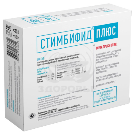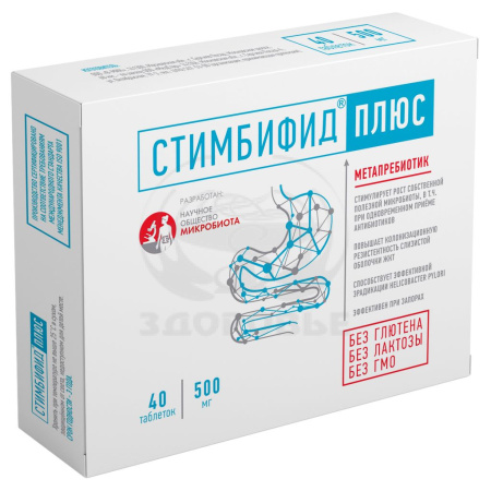 Микробиота кишечника здорового человека на 90% состоит из бифидобактерий - микроорганизмов, необходимых для нормальной жизнедеятельности человека.Неправильное питание, вредные привычки, неблагоприятное воздействие окружающей среды, использование антибиотиков снижают количество бифидобактерий в кишечнике, а их место немедленно занимают патогенные, вредные для человека микробы.Это нарушение биологического равновесия между условно-патогенной и полезной микробиотой называется дисбактериозом, что приводит к существенному снижению колонизационной резистентности слизистой оболочки желудочно-кишечного тракта. К сожалению, в настоящее время около 95% населения России страдает дисбактериозом кишечника.При этом клинико-лабораторном синдроме нарушается нормальное пищеварение, появляются диарея или запоры, спастические боли в области живота, повышенное газообразование, аллергические реакции. В дальнейшем это состояние ведет к ухудшению работы печени, поджелудочной железы, снижению иммунитета, трамбообразованию, заболеваниям опорно-двигательного аппарата и другим патологиям.Стимбифид выпускается в виде таблеток плоско-овальной формы белого цвета массой 500 мг.Описание состава и действия: Метапребиотик СТИМБИФИД ПЛЮС является инновационной разработкой российских ученых Научного общества «Микробиота» на основе глубоких фундаментальных исследований кишечной микробиоты, а также безопасных и эффективных методов ее коррекции.Исследования легли в основу «Научного открытия» и защищены двумя патентами Российской Федерации. Метапребиотик СТИМБИФИД ПЛЮС восстанавливает индивидуальную микробиоту кишечника, создавая приоритетные условия для размножения бифидобактерий, лактобацилл и кишечной палочки, которые, угнетая рост патогенной микробиоты, вытесняют ее из организма.Существенный рост нормобиоты приводит к повышению колонизационной резистентности слизистой оболочки ЖКТ. Метапребиотик СТИМБИФИД ПЛЮС является дальнейшим развитием и глубокой оптимизацией пребиотикаСтимбифид и состоит из двух компонентов - пребиотического и метабиотического.Узконаправленный пребиотический компонент - природные фруктоолигосахариды (ФОС) и фруктополисахариды (ФПС) с оптимизированным соотношением коротких (GFn, n=2-8) и длинных (GFn, п=2-60) цепочек, что обеспечивает снижение бифидобактерий эксклюзивным питанием по всей длине толстой кишки. Метабиотический компонент- лактат кальция.Является мощным стимулятором роста и размножения нормобиоты (патенты РФ).
