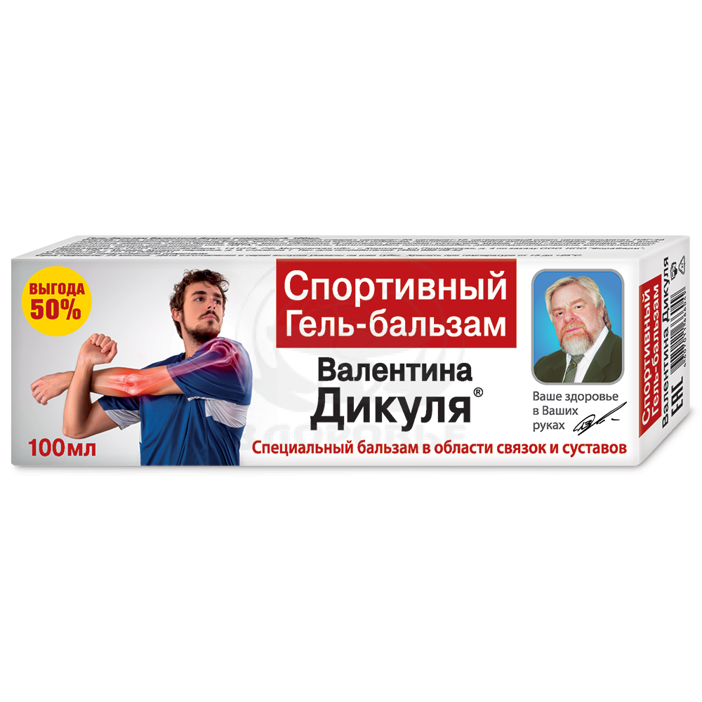 Спортивный бальзам Валентина Дикуля - высокоэффективное средство для наружногоногоного применения при небольших закрытых (без повреждения кожи) спортивных и бытовых травмах, разработанные академиком Валентином Ивановичем Дикулем. По данным центра спортивной травмы Минздрава РФ, из 100 спортсменов, занимавших призовые места на крупнейших международных турнирах, 90 наряду с медалями получили различные травмы. Нередко люди получают травмы и в быту: на прогулке, при уборке дома, на даче, во время активного отдыха. Из-за медленной регенерации тканей, особенно опасны травмы для пожилых людей. Действие бальзама направлено на активизацию восстановительных процессов в поврежденных тканях. Уменьшению болевого синдрома и предупреждение осложнений. Натуральные компоненты бальзама стимулируют кровообращение и лимфоотток, способствуют улучшению метаболизма в травмированной области, снятию воспаления и отечности, препятствуют разрушающему действию свободных радикалов, которые усиленно образуются в месте травмы. Спортивный бальзам, созданный В. Дикулем в результате многолетней практики, поможет максимально быстро избавиться от последствий травм, как спортивных, так и бытовых.