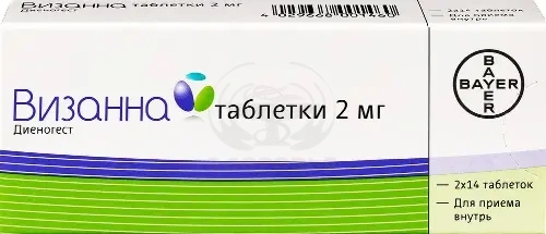 ВсасываниеПосле перорального приема диеногест быстро и практически полностью всасывается. Cmax в сыворотке крови, составляющая 47 нг/мл, достигается примерно через 1.5 ч после разового перорального приема. Биодоступность составляет около 91%. Фармакокинетика диеногеста в дозовом диапазоне от 1 до 8 мг характеризуется дозозависимостью.РаспределениеДиеногест связывается с сывороточным альбумином и не связывается с глобулином, связывающим половые гормоны (ГСПГ), а также с кортикостероид-связывающим глобулином (КСГ). 10% от общей концентрации вещества в сыворотке крови находится в виде свободного стероида, тогда как около 90% неспецифически связано с альбумином.Кажущийся Vd диеногеста составляет 40 л.Фармакокинетика диеногеста не зависит от уровня ГСПГ. Концентрация диеногеста в сыворотке крови после ежедневного приема возрастает примерно в 1.24 раза, достигая равновесной концентрации через 4 дня приема. Фармакокинетика диеногеста после многократного приема Визанны может быть спрогнозирована на основе фармакокинетики после разового приема.МетаболизмДиеногест почти полностью метаболизируется преимущественно путем гидроксилирования с образованием нескольких практически неактивных метаболитов. Исходя из результатов исследований in vitro и in vivo, основным ферментом, участвующим в метаболизме диеногеста, является CYP3A4. Метаболиты выводятся очень быстро, так что преобладающей фракцией в плазме крови является неизмененный диеногест.Скорость метаболического клиренса из сыворотки крови составляет 64 мл/мин.ВыведениеКонцентрация диеногеста в сыворотке крови снижается двухфазно. T1/2 в терминальной фазе составляет приблизительно 9-10 ч. После приема внутрь в дозе 0.1 мг/кг диеногест выводится в виде метаболитов, которые выделяются через почки и кишечник в соотношении примерно 3:1. T1/2 метаболитов при их экскреции почками составляет 14 ч. После перорального приема приблизительно 86% полученной дозы выводится в течение 6 дней, причем основная часть выводится за первые 24 ч, преимущественно почками.