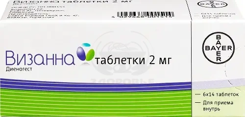 ВсасываниеПосле перорального приема диеногест быстро и практически полностью всасывается. Cmax в сыворотке крови, составляющая 47 нг/мл, достигается примерно через 1.5 ч после разового перорального приема. Биодоступность составляет около 91%. Фармакокинетика диеногеста в дозовом диапазоне от 1 до 8 мг характеризуется дозозависимостью.РаспределениеДиеногест связывается с сывороточным альбумином и не связывается с глобулином, связывающим половые гормоны (ГСПГ), а также с кортикостероид-связывающим глобулином (КСГ). 10% от общей концентрации вещества в сыворотке крови находится в виде свободного стероида, тогда как около 90% неспецифически связано с альбумином.Кажущийся Vd диеногеста составляет 40 л.Фармакокинетика диеногеста не зависит от уровня ГСПГ. Концентрация диеногеста в сыворотке крови после ежедневного приема возрастает примерно в 1.24 раза, достигая равновесной концентрации через 4 дня приема. Фармакокинетика диеногеста после многократного приема Визанны может быть спрогнозирована на основе фармакокинетики после разового приема.МетаболизмДиеногест почти полностью метаболизируется преимущественно путем гидроксилирования с образованием нескольких практически неактивных метаболитов. Исходя из результатов исследований in vitro и in vivo, основным ферментом, участвующим в метаболизме диеногеста, является CYP3A4. Метаболиты выводятся очень быстро, так что преобладающей фракцией в плазме крови является неизмененный диеногест.Скорость метаболического клиренса из сыворотки крови составляет 64 мл/мин.ВыведениеКонцентрация диеногеста в сыворотке крови снижается двухфазно. T1/2 в терминальной фазе составляет приблизительно 9-10 ч. После приема внутрь в дозе 0.1 мг/кг диеногест выводится в виде метаболитов, которые выделяются через почки и кишечник в соотношении примерно 3:1. T1/2 метаболитов при их экскреции почками составляет 14 ч. После перорального приема приблизительно 86% полученной дозы выводится в течение 6 дней, причем основная часть выводится за первые 24 ч, преимущественно почками.