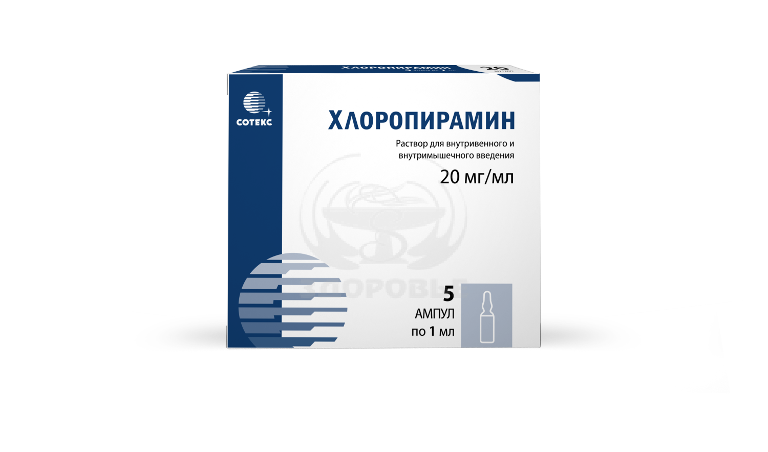 хлоропирамина гидрохлорид* 20 мг * в пересчете на 100% вещество. Вспомогательные вещества: вода д/и - до 1 мл.