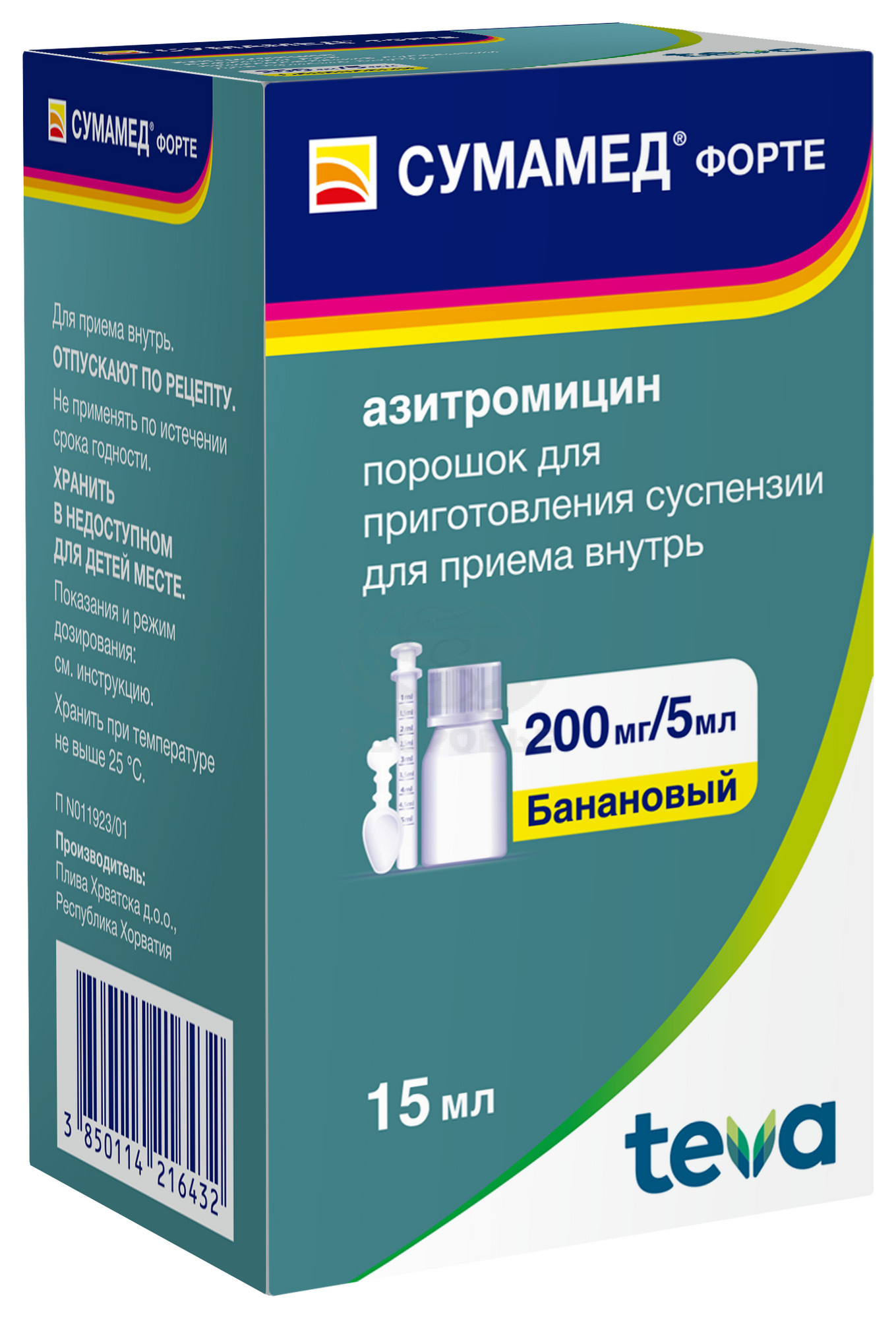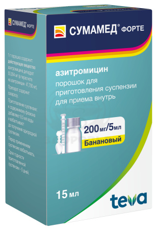 Внутрь 1 раз в сутки за 1 час до или через 2 часа после еды. После приема препарата Сумамед® форте ребенку необходимо обязательно предложить выпить несколько глотков воды чтобы он смог проглотить остатки суспензии.Перед каждым приемом препарата содержимое флакона тщательно взбалтывают до получения однородной суспензии. Если необходимый объем суспензии не был отобран из флакона в течение 20 минут после взбалтывания суспензию следует взболтать снова отобрать необходимый объем и дать ребенку.Необходимую дозу отмеряют с помощью шприца для дозирования с ценой деления 1 мл и номинальной вместимостью суспензии 5 мл (200 мг азитромицина) или мерной ложки с номинальной вместимостью суспензии 2 5 мл (100 мг азитромицина) или 5 мл (200 мг азитромицина) вложенных в картонную упаковку вместе с флаконом.После использования шприц (предварительно разобрав его) и мерную ложку промывают проточной водой сушат и хранят в сухом месте до следующего приема препарата Сумамед® форте.При инфекциях верхних и нижних дыхательных путей ЛОР-органов кожи и мягких тканейИз расчета 10 мг/кг массы тела 1 раз в день в течение 3 дней (курсовая доза 30 мг/кг).Для точного дозирования препарата Сумамед® форте в соответствии с массой тела ребенка следует использовать приведенную ниже таблицу.Масса тела - Объем суспензии (мл) на 1 прием10-14 кг - 2 5 мл суспензии (100 мг азитромицина)15-24 кг - 5 0 мл суспензии (200 мг азитромицина)25-34 кг - 7 5 мл суспензии (300 мг азитромицина)35-44 кг - 10 0 мл суспензии (400 мг азитромицина)не менее 45 кг12 5 мл суспензии (500 мг азитромицина)(соответствует дозе для взрослых пациентов)При фарингите/тонзиллите вызванных Streptococcus pyogenes препарат Сумамед® форте применяют в дозе 20 мг/кг/сут в течение 3 дней (курсовая доза 60 мг/кг). Максимальная суточная доза составляет 500 мг.Детям с массой тела до 10 кг следует принимать препарат Сумамед® в форме порошка для приготовления суспензии для приема внутрь с концентрацией 100 мг/5 мл.При болезни Лайма (начальная стадия боррелиоза) – мигрирующей эритеме (erythema migrans)В 1-й день в дозе 20 мг/кг/сут затем со 2-го по 5-й день в дозе 10 мг/кг/сут (курсовая доза 60 мг/кг).При нарушении функции почек: у пациентов с СКФ 10-80 мл/мин коррекция дозы не требуется.При нарушении функции печени: при применении у пациентов с нарушением функции печени легкой и средней степени тяжести коррекция дозы не требуется.Пожилые пациенты: коррекция дозы не требуется. У пожилых пациентов при применении препарата Сумамед® форте рекомендуется соблюдать особую осторожность в связи с возможным наличием проаритмогенных факторов которые могут повышать риск развития сердечной аритмии и аритмии типа пируэт.Способ приготовления и хранения суспензииК содержимому флакона предназначенного для приготовления 15 мл суспензии (номинальный объем) с помощью шприца для дозирования добавляют 9 5 мл воды. Взбалтывают до получения однородной суспензии. Объем полученной суспензии составит около 20 мл что превышает номинальный объем приблизительно на 5 мл. Это предусмотрено для компенсации неизбежных потерь суспензии при дозировании препарата. Приготовленную суспензию можно хранить при температуре не выше 25 °С. Срок годности приготовленной суспензии – 5 дней.К содержимому флакона предназначенного для приготовления 30 мл суспензии (номинальный объем) с помощью шприца для дозирования добавляют 