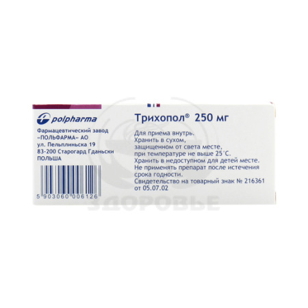 С осторожностью следует назначать Трихопол пациентам с тяжелой печеночной недостаточностью, т.к. как в результате замедления метаболизма концентрация метронидазола и его метаболитов в плазме возрастает. Из-за замедления экскреции требуется соблюдать осторожность при выборе дозы метронидазола у пациентов с почечной недостаточностью. Требуется осторожность при назначении Трихопола пациентам с угнетением костномозгового кроветворения и функций ЦНС, а так же пациентам пожилого возраста. Появление атаксии, головокружения и любое другое ухудшение неврологического статуса больных требует прекращения лечения. При длительной терапии метронидазолом (более 10 дней) следует контролировать картину периферической крови и функцию печени. При лейкопении возможность продолжения лечения зависит от риска развития инфекционного процесса. Следует избегать применения метронидазола у пациентов с порфирией. Трихопол может вызывать иммобилизацию трепонем, что приводит к ложноположительному тесту Нельсона. При лечении трихомонадного вагинита у женщин и трихомонадного уретрита у мужчин необходимо воздерживаться от половой жизни. Обязательно одновременное лечение половых партнеров. После терапии трихомониаза следует провести контрольные пробы в течение трех очередных циклов до и после менструации. После лечения лямблиоза, если симптомы сохраняются, через 3-4 недели необходимо провести 3 анализа кала с интервалами в несколько дней (у некоторых успешно пролеченных больных непереносимость лактозы, вызванная инвазией, может сохраняться течение нескольких недель или месяцев, напоминая симптомы лямблиоза). Пациентам необходимо воздерживаться от употребления алкоголя во время терапии метронидазолом, а также в течение, по крайней мере, 48 ч после завершения лечения, из-за возможности развития дисульфирамоподобных реакций: абдоминальная боль спастического характера, тошнота, рвота, головная боль, внезапный прилив крови к лицу. Во время лечения метронидазолом моча может приобрести темную или красно-коричневую окраску в связи с присутствием водорастворимых красителей. Использование в педиатрии В комбинации с амоксициллином не рекомендуется применять Трихопол у детей и подростков в возрасте до 18 лет. Влияние на способность к вождению автотранспорта и управлению механизмами При приеме препарата следует избегать потенциально опасных видов деятельности, требующих повышенной концентрации внимания, быстроты психомоторных реакций, особенно вождения транспортных средств и обслуживания механизмов.