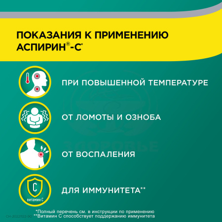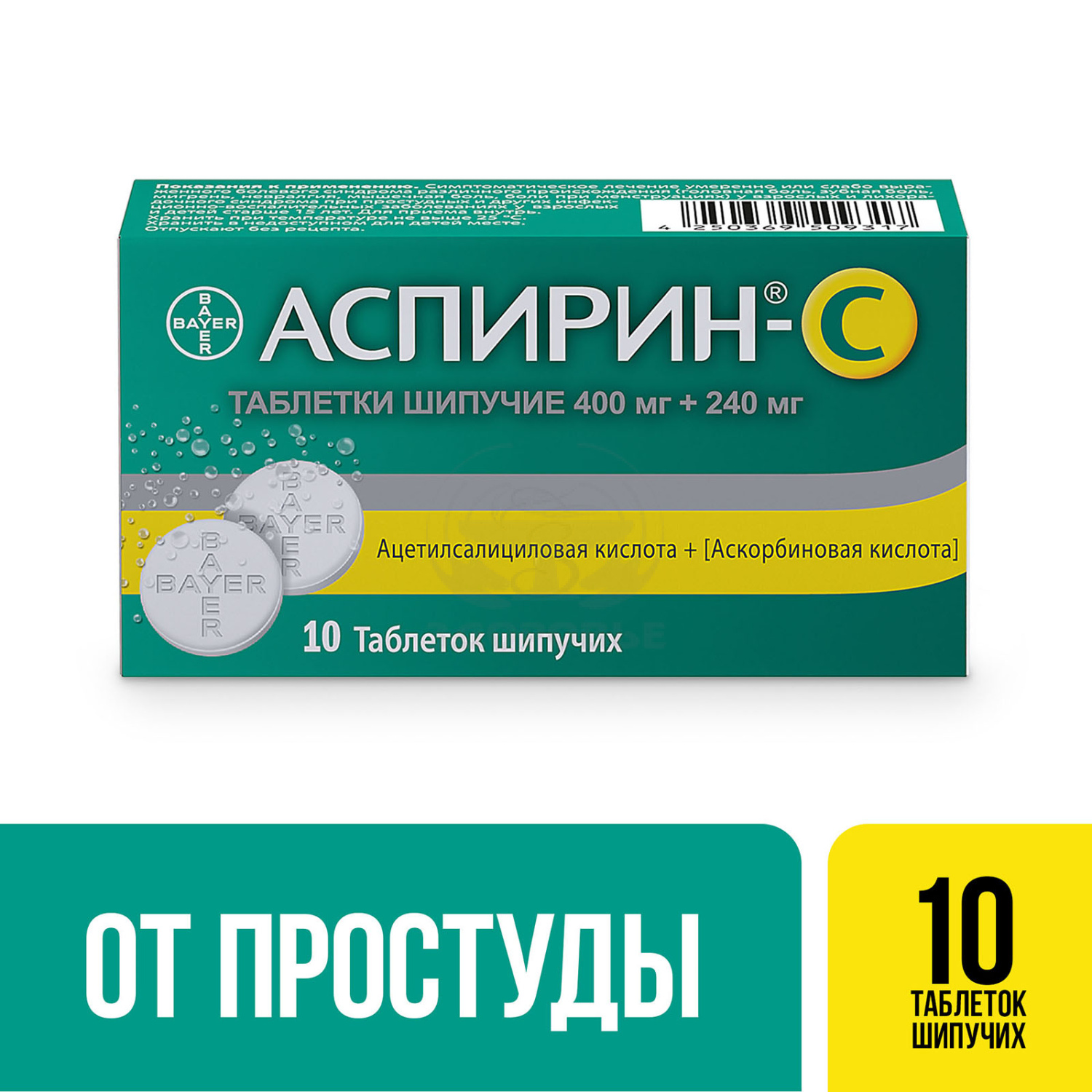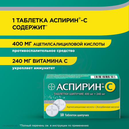 Действующие вещества: ацетилсалициловая кислота 400 мг, аскорбиновая кислота (витамин С)