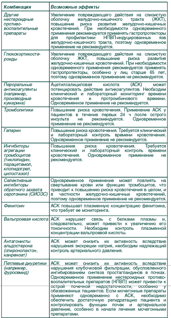 В силу ингибирования АСК агрегации тромбоцитов препарат может приво- дить к удлинению времени кровотечения в ходе и после хирургических вмешательств (в том числе небольших, например, экстракции зуба).