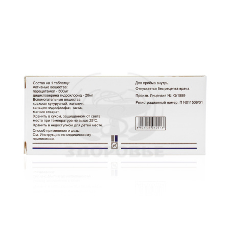 1 таб. парацетамол 500 мг дицикловерина гидрохлорид 20 мг. Вспомогательные вещества: крахмал кукурузный, желатин, кальция гидрофосфат, тальк, магния стеарат.