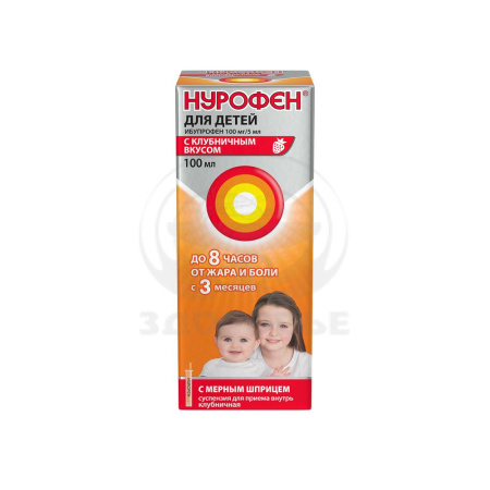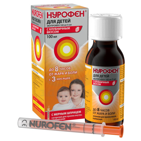 Нурофен® для детей, суспензия для приема внутрь клубничная, подходит для детей с 3 месяцев до 12 лет*. Борется с жаром и болью, действуя до 8 часов. Суспензия имеет приятный клубничный вкус, не содержит сахара и красителей, а каждый флакон в комплекте с удобным мерным шприцем.
