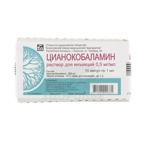Цианокобаламин ампулы 500мкг 1мл 10 (вит. В12)