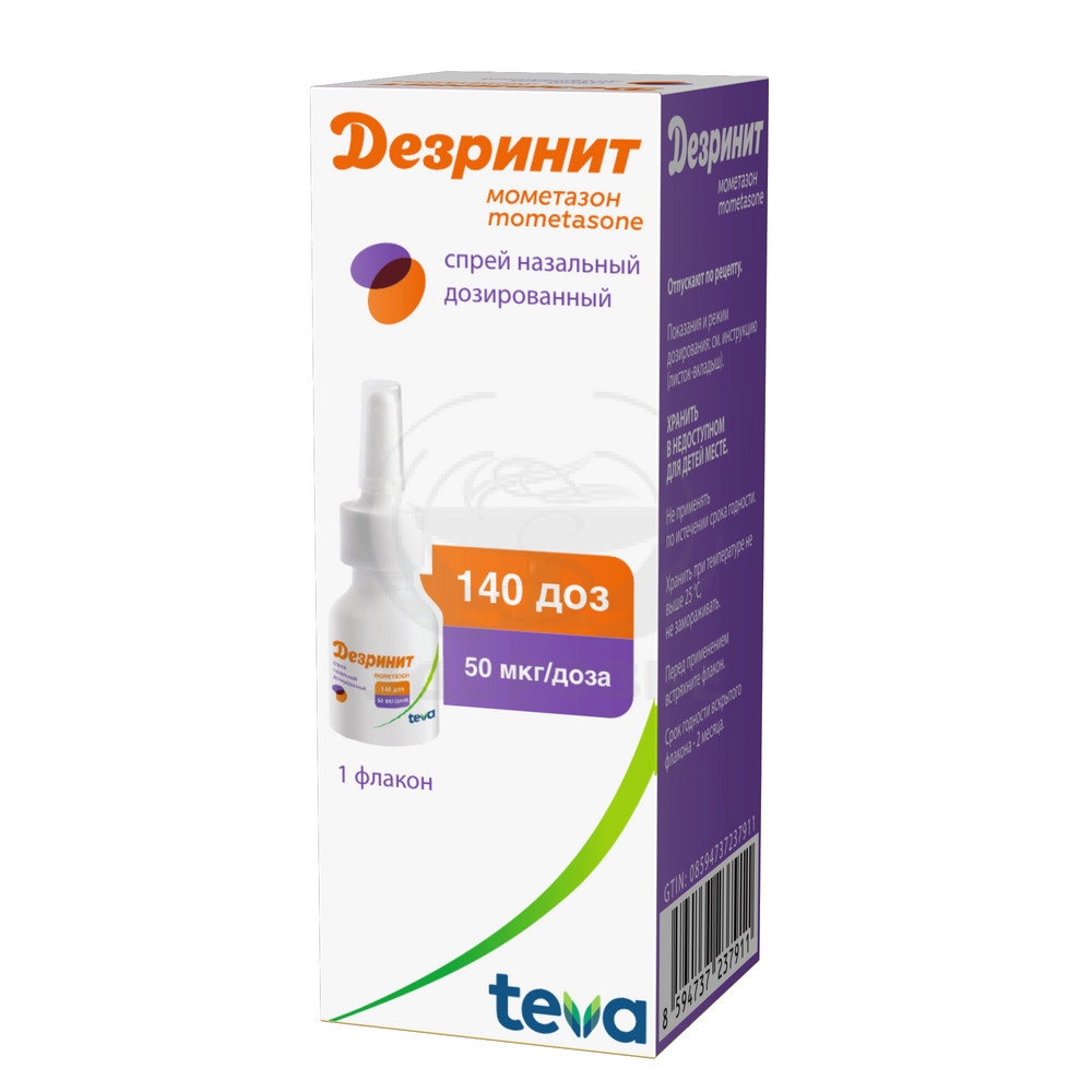 При применении мометазона в течение 12 мес признаков атрофии слизистой оболочки носа отмечено не было. При исследовании биоптатов слизистой оболочки носа выявлено, что мометазон проявлял тенденцию к нормализации гистологической картины. При применении препарата в течение длительного времени (как и при всяком долгосрочном лечении) необходим периодический осмотр слизистой оболочки носа врачом-оториноларингологом.При развитии местной грибковой инфекции носа или глотки лечение препаратом рекомендуется прекратить и начать проведение специфической терапии.Сохраняющееся в течение длительного времени раздражение слизистой оболочки полости носа и глотки является показанием к отмене препарата.При длительном применении препарата признаков подавления функции гипоталамо-гипофизарно-надпочечниковой системы не наблюдалось.Пациенты, которые переходят на терапию мометазоном после длительного лечения ГКС системного действия, требуют к себе особого внимания. Отмена ГКС системного действия у таких пациентов может привести к недостаточности функции надпочечников, что может потребовать принятия соответствующих мер.Во время перехода от лечения ГКС системного действия к терапии мометазоном у некоторых пациентов могут возникнуть симптомы отмены ГКС для системного применения (например, боль в суставах и/или мышцах, чувство усталости, депрессия), несмотря на уменьшение выраженности симптомов, связанных с поражением слизистой оболочки носа, таких больных необходимо специально убеждать в целесообразности продолжения лечения препаратом Дезринит. Переход от ГКС системного действия к местным ГКС может также выявить уже существовавшие, но маскировавшиеся терапией ГКС системного действия аллергические заболевания, такие как аллергический конъюнктивит и экзема.Эффективность и безопасность мометазона не изучена при лечении односторонних полипов, полипов, связанных с муковисцидозом и полипов, которые полностью закрывают носовую полость. Односторонние полипы неправильной формы или кровоточащие следует дополнительно обследовать.Пациенты, которым проводится терапия ГКС, обладают сниженной иммунной реактивностью, поэтому их следует предупредить о повышенном риске инфицирования при контакте с больными некоторыми инфекционными заболеваниями (например, ветряной оспой, корью), а также о необходимости врачебной консультации, если такой контакт произошел.При длительном применении назальных ГКС в высоких дозах возможно развитие системных побочных эффектов. Вероятность развития этих эффектов гораздо меньше, чем при применении системных ГКС, и может различаться у отдельных пациентов, а также между разными ГКС. К потенциальным системным эффектам относятся синдром Кушинга, характерные признаки кушингоида, подавление функции надпочечников, задержка роста у детей и подростков, катаракта, глаукома и, реже - ряд психологических или поведенческих эффектов, включая психомоторную гиперактивность, нарушение сна, беспокойство, депрессию или агрессию (особенно у детей).Рекомендуется регулярно контролировать рост детей, получающих длительную терапию мометазоном. При замедлении роста следует пересмотреть проводимую терапию с целью снижения дозы мометазона до минимальной эффективной, позволяющей контролировать симптомы заболев