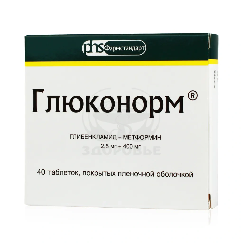 Глюконорм; представляет собой фиксированную комбинацию двух пероральных гипогликемических средств различных фармакологических групп: метформина и глибенкламида.;Метформин относится к группе бигуанидов и снижает уровень глюкозы в сыворотке крови за счет повышения чувствительности периферических тканей к действию инсулина и усиления захвата глюкозы. Снижает всасывание углеводов в ЖКТ и тормозит глюконеогенез в печени. Препарат также оказывает благоприятное действие на липидный профиль крови, снижая уровень общего холестерина. ЛПНП и триглицеридов. Не вызывает гипогликемических реакций.;Глибенкламид относится к группе производных сульфонилмочевины II поколения. Стимулирует секрецию инсулина путем снижения порога раздражения глюкозой ?-клеток поджелудочной железы, повышает чувствительность к инсулину и степень его связывания с клетками-мишенями, увеличивает высвобождение инсулина, усиливает влияние инсулина на поглощение глюкозы мышцами и печенью, тормозит липолиз в жировой ткани. Действует во второй стадии секреции инсулина.
