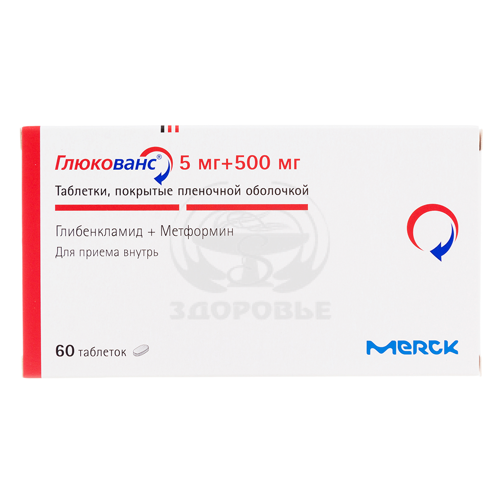 Глибенкламид. При приеме внутрь абсорбция из желудочно-кишечного тракта составляет более 95%. Глибенкламид, входящий в состав препарата Глюкованс® является микронизированным. Пик концентрации в плазме достигается примерно за 4 часа, объем распределения - около 10 л. Связь с белками плазмы составляет 99%. Почти полностью метаболизируется в печени с образованием двух неактивных метаболитов, которые выводятся почками (40 %) и с желчью (60 %). Период полувыведения – от 4 до 11 часов.Метформин после приема внутрь абсорбируется из желудочно-кишечного тракта достаточно полно, пик концентрации в плазме достигается в течение 2,5 часов. Примерно 20-30% метформина выводится через желудочно-кишечный тракт в неизменном виде. Абсолютная биодоступность составляет от 50 до 60%.Метформин быстро распределяется в тканях, практически не связывается с белками плазмы. Подвергается метаболизму в очень слабой степени и выводится почками. Период полувыведения составляет в среднем 6,5 часов. При нарушении функции почек, почечный клиренс снижается, так же как и клиренс креатинина, при этом период полувыведения увеличивается, что приводит к увеличению концентрации метформина в плазме крови. Сочетание метформина и глибенкламида в одной лекарственной форме имеет ту же биодоступность, что и при приеме таблеток, содержащих метформин или глибенкламид изолированно. На биодоступность метформина в сочетании с глибенкламидом не влияет прием пищи, так же, как и на биодоступность глибенкламида. Однако скорость абсорбции глибенкламида возрастает при приеме пищи.