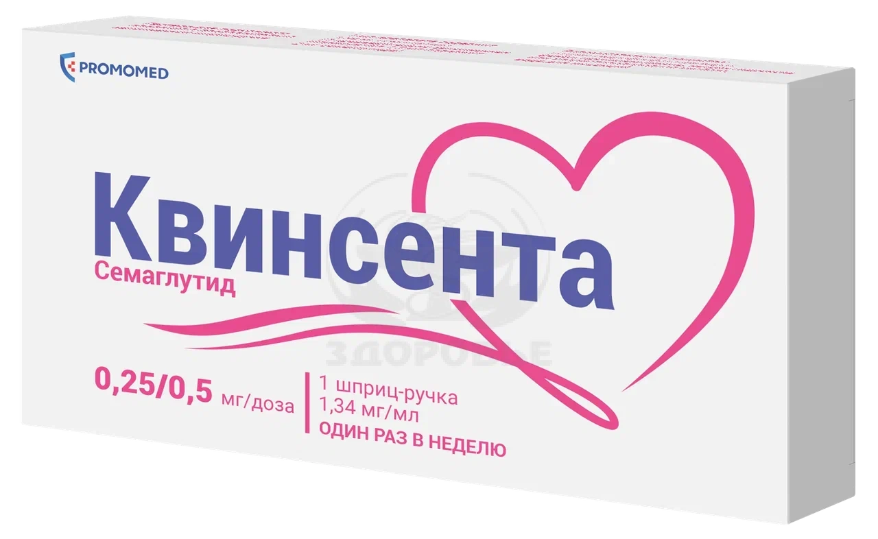 Для препарата Квинсента, раствор для подкожного введения, 0,25/0,5 мг/доза - в предварительно заполненной шприц-ручке – позволяет вводить дозы 0,25 мг или 0,5 мг. Данная шприц-ручка предназначена для постепенного увеличения дозы от начальной – 0,25 мг и поддержания терапевтической дозы – 0,5 мг. Одна шприц-ручка содержит 1,5 мл раствора (2 мг семаглутида). Совместима с любыми иглами для шприц-ручек.