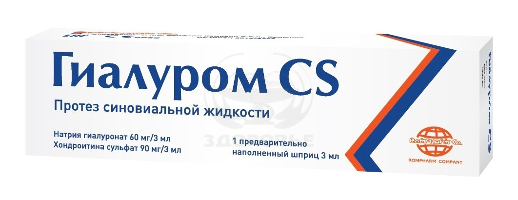 1 предварительно наполненный шприц Гиалуром CS. Гиалуронат натрия 60,00 мг. Хондроитин сульфат натрия 90,00 мг. Натрия хлорид 10,50 мг. Натрия дигидрофосфат моногидрат 1,35 мг.Динатрийфосфат додекагидрат 15,15 мг.Гидроксид натрия и/или хлористоводородная кислота (для корректировки рН). Вода для инъекций до 3,00 мл.