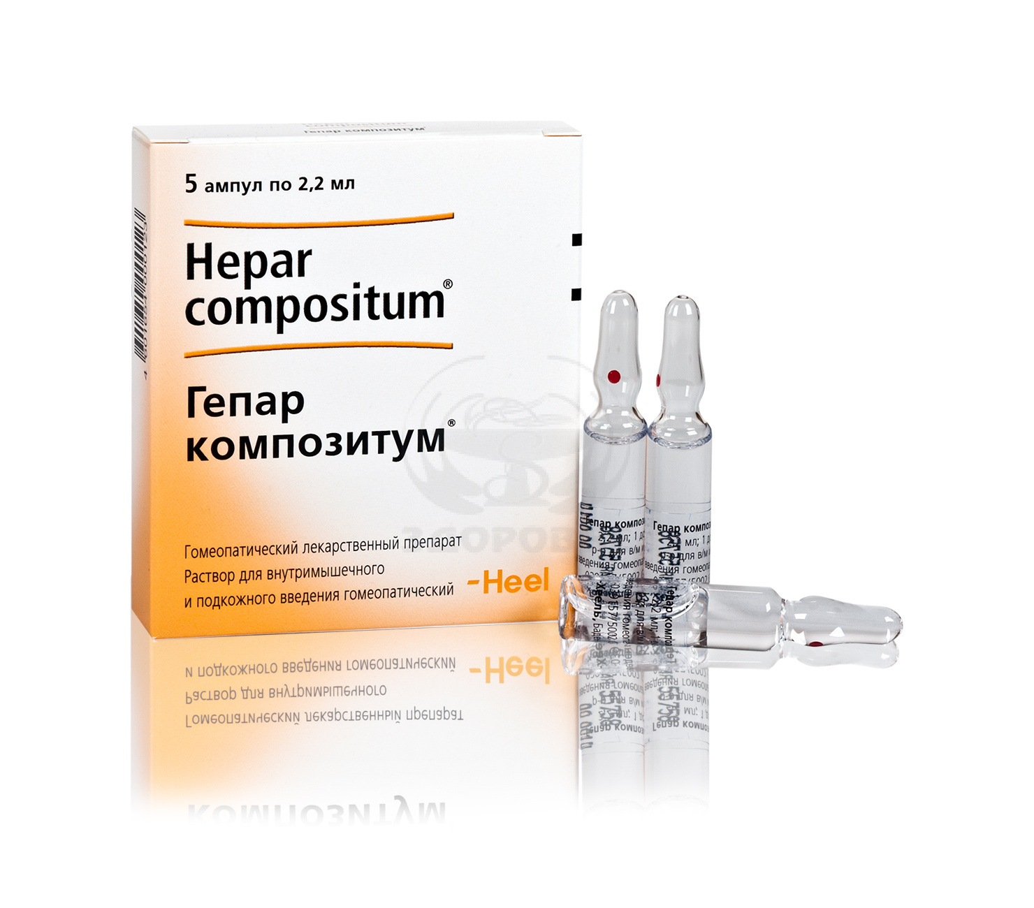 Гепар Композитум – комплексный лекарственный препарат, содержащий гомеопатические разведения 24 активных компонентов, в том числе в состав препарата водят разведения 6 сиус-органных компонентов, цианокобаламин, коферменты, внутриклеточные катализаторы, растительные и минеральные компоненты. Кроме того, в состав препарата входит гомеопатизированный аллопатический компонент гистамин. Препарат улучшает детоксикационную функцию печени, стимулирует метаболизм и выведение токсинов из организма, обладает желчегонным, антиоксидантным и гепатопротекторным действием. Гепар Композитум оказывает также некоторый венотонизирующий эффект и улучшает кровообращение у пациентов с застойными явлениями в малом тазу и воротной вене. Препарат также стимулирует регенерацию тканей, улучшает состояние кожи, оказывает положительное влияние на углеводный и липидный обмены.