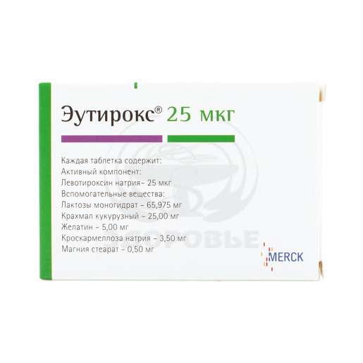 1 таблетка содержит:Активное вещество: левотироксин натрия 25 мкг.Вспомогательные вещества: крахмал кукурузный - 25.00 мг, желатин - 5.00 мг, кроскармеллоза натрия - 3.50 мг, магния стеарат - 0.50 мг, лактозы моногидрат - 65.975 мг.
