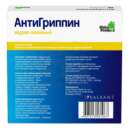 | Действующее вещество | Аскорбиновая кислота (Ascorbic acid)Парацетамол (Paracetamol)Хлорфенамина малеат (Chlorphenamine maleate) |