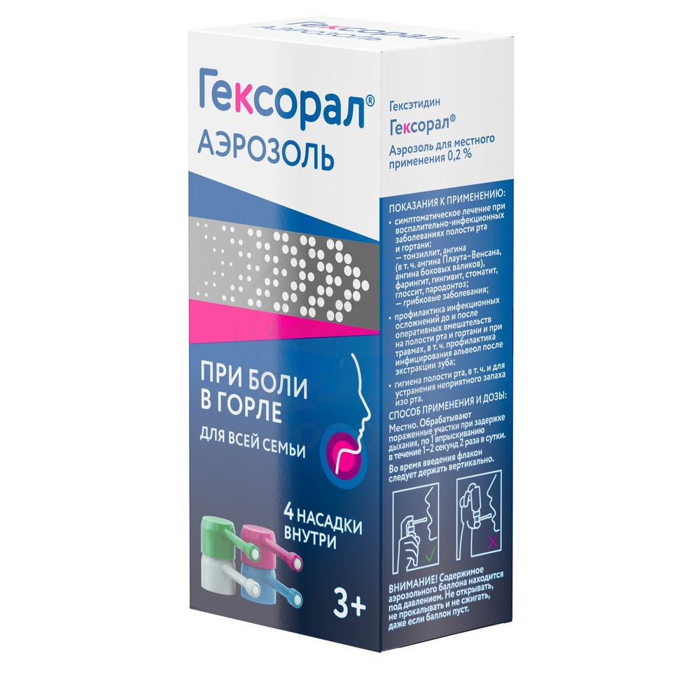 Гексорал® — современное средство от боли в горле для взрослых и детей от 3 лет, предназначенное для лечения симптомов таких заболеваний, как ОРЗ, ОРВИ, фарингит, тонзиллит и ангина, стоматит, пародонтит, грибковые заболевания, а также гигиеническая полость рта, в т. гл. и для устранения неприятных проблем.