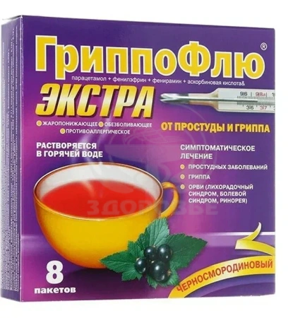Комбинированный препарат. Парацетамол - ненаркотический анальгетик, воздействует на центры боли и терморегуляции. Оказывает анальгезирующее и жаропонижающее действие. Уменьшает головную и мышечные боли, явления лихорадки, смягчает боли в горле. Фенирамин - блокатор Н1-гистаминовых рецепторов, антиаллергическое средство, снижает ринорею и слезотечение, устраняет спастические явления. Фенилэфрин - адреномиметик с умеренным сосудосуживающим действием, уменьшает заложенность носа и облегчает дыхание через нос. Аскорбиновая кислота (витамин С) восполняет повышенную потребность в витамине С при простудных заболеваниях и гриппе, особенно на начальных стадиях заболевания. Повышает устойчивость организма к инфекционным заболеваниям.