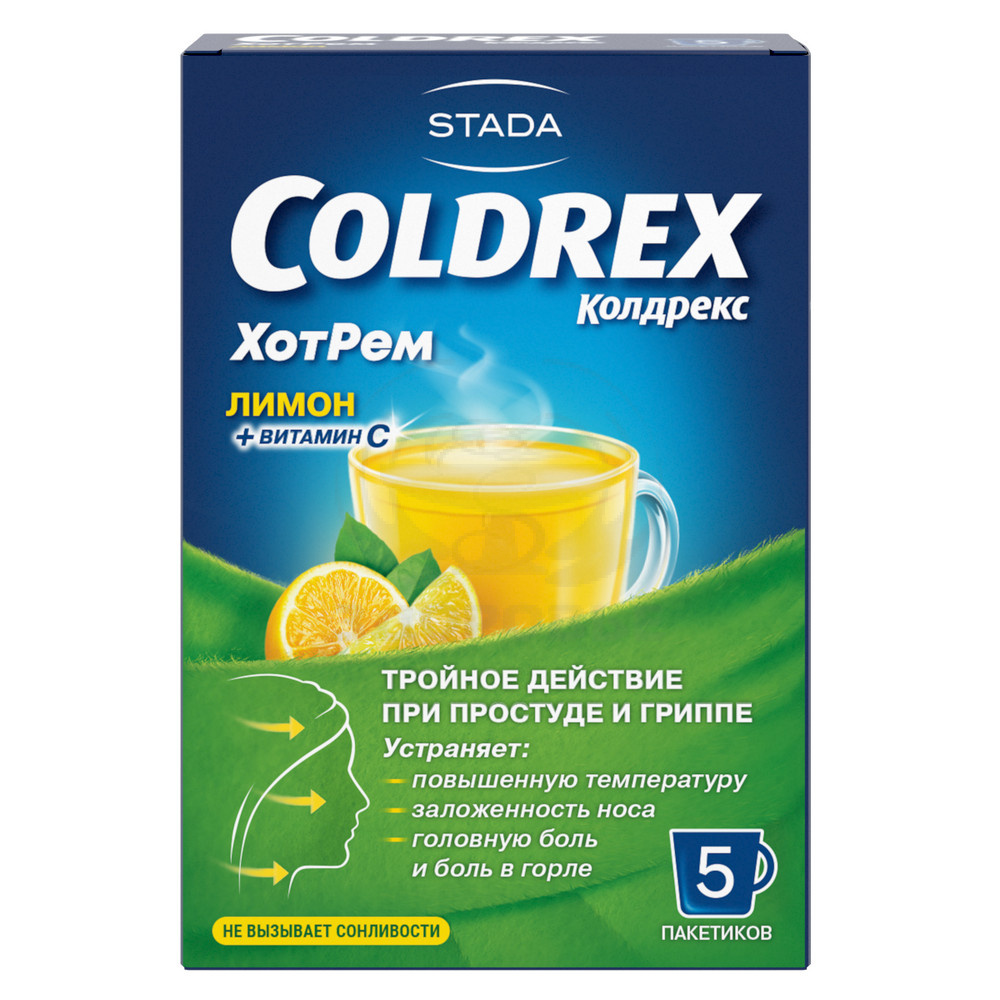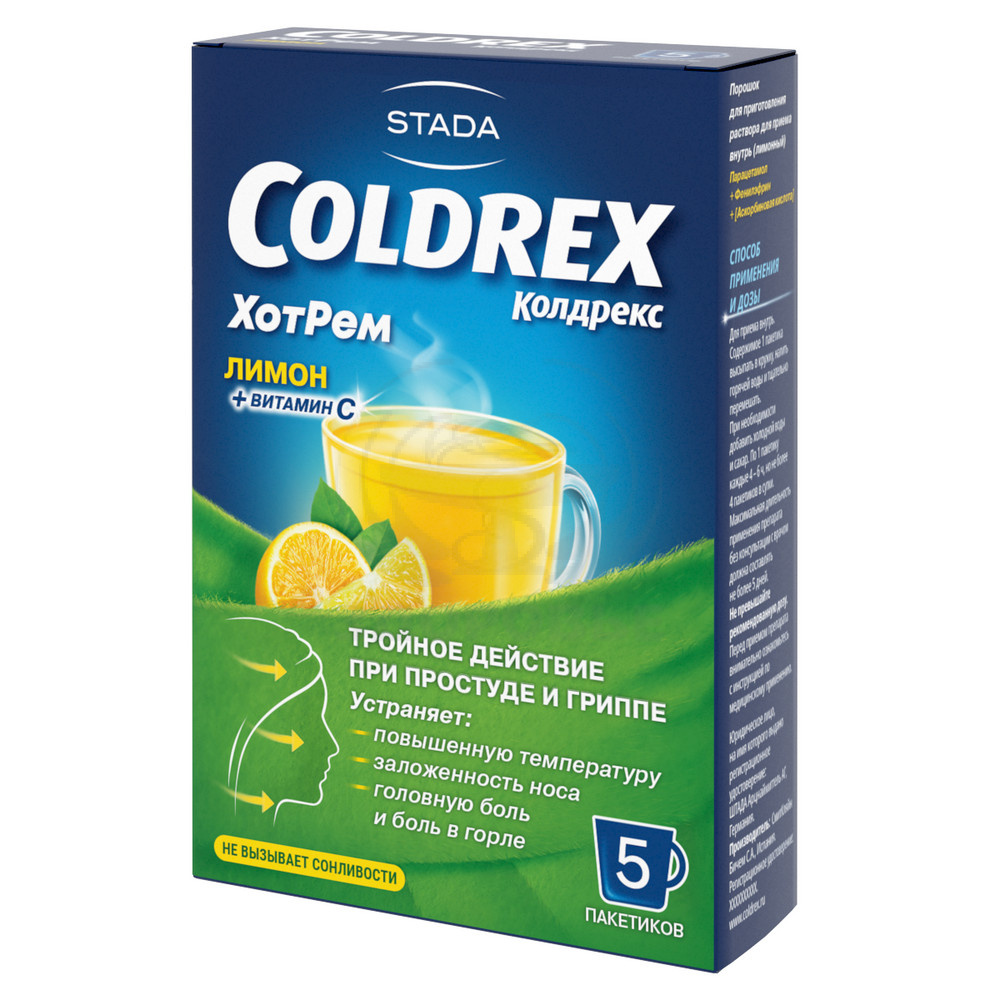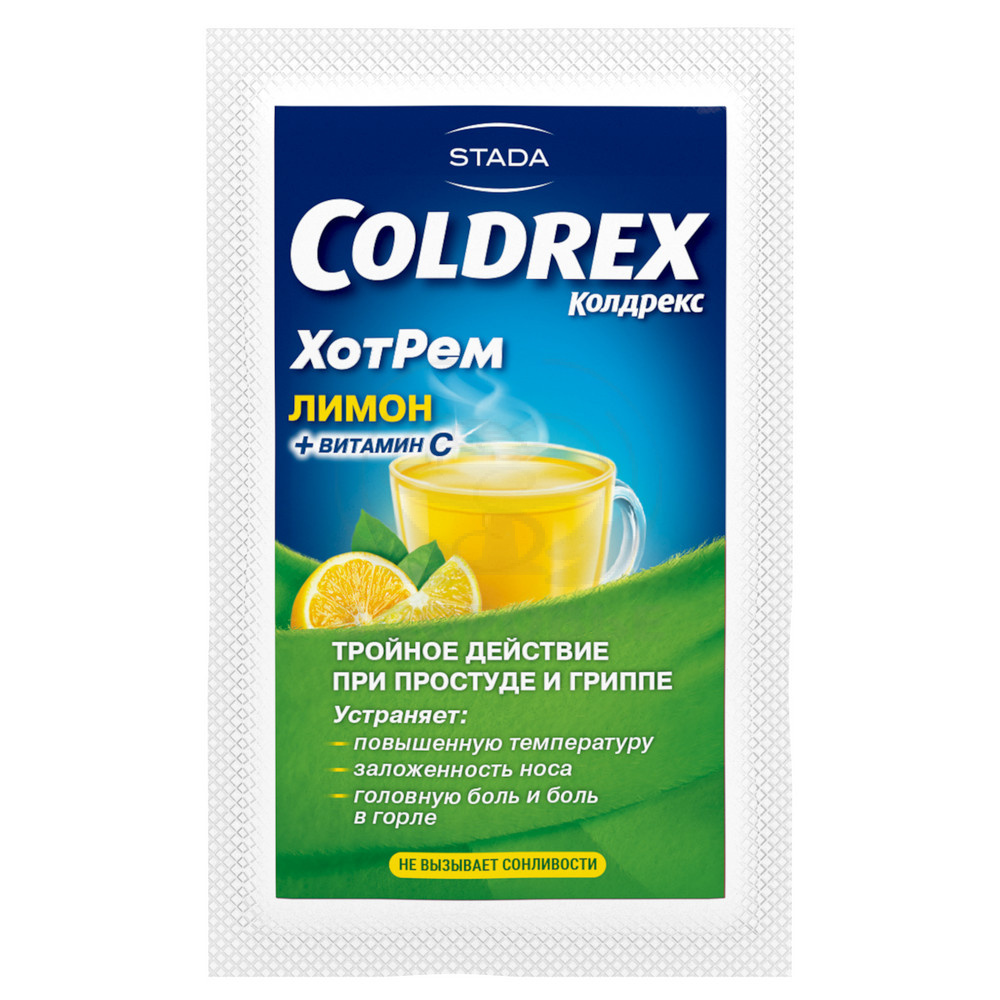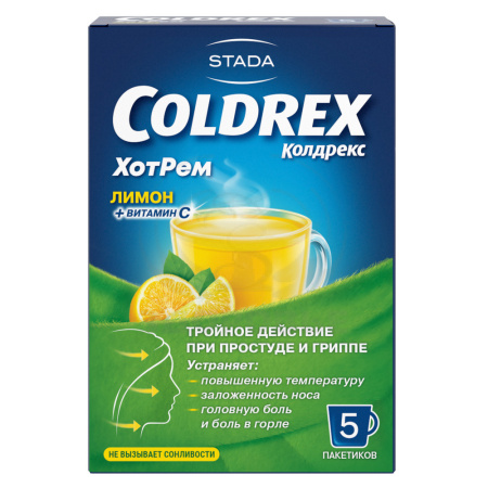 Пациент должен быть проинформирован о том, что если симптомы заболевания сохраняются после 5 дней применения препарата, следует прекратить его прием и проконсультироваться с врачом.Препарат следует принимать только в рекомендуемых дозах.Пациент должен прекратить прием препарата и немедленно обратиться к врачу , если возникают следующие побочные эффекты:-аллергические реакции: кожный зуд или покраснение кожи, затруднение дыхания или отек губ, языка, горла или лица;-сыпь или шелушение на коже, образования язвочек на слизистой рта;-синяки или кровоточивость;-потеря зрения. Это может быть следствием повышения внутриглазного давления. Очень редко, но с наибольшей вероятностью этот побочный эффект наблюдается у пациентов с глаукомой;-ощущение сильного сердцебиения или увеличение ЧСС или нарушений сердечного ритма;-затруднения при мочеиспускании. Чаще этот побочный эффект наблюдается у пациентов с гипертрофией предстательной железы.Не следует принимать препарат, если ранее наблюдались нарушения дыхания при приеме ацетилсалициловой кислоты или других НПВП.Препарат не следует принимать одновременно с другими препаратами, содержащими парацетамол, а также другими ненаркотическими анальгетиками (метамизол натрия), НПВП (ацетилсалициловая кислота, ибупрофен), барбитуратами, противосудорожными лекарственными средствами, рифампицином и хлорамфениколом, симпатомиметиками (такими как деконгестанты, средства, подавляющие аппетит, амфетаминоподобные психостимулирующие средства), с другими средствами для облегчения симптомов простуды и гриппа.При проведении анализов на определение мочевой кислоты иуровня глюкозы в крови пациент должен сообщить врачу о применении препарата Колдрекс ХотРем, т.к. препарат может искажать результаты лабораторных тестов, оценивающих концентрацию глюкозы и мочевой кислоты.Перед приемом препарата Колдрекс ХотРем (лимонный) необходима консультация врача в случае:-приема метоклопрамида, домперидона (применяемых для устранения тошноты и рвоты) или колестирамина, используемого для снижения концентрации холестерина в крови;-приема препаратов для снижения свертываемости крови (например, варфарина);-соблюдения диеты с пониженным содержанием натрия - каждый пакетик содержит 0.12 г натрия;-тяжелых инфекционных заболевании (в т.ч. сепсиса) у пациентов с дефицитом глутатиона, т.к. на фоне приема парацетамола может увеличиться риск метаболического ацидоза, признаками которого являются нарушение частоты и глубины дыхания, сопровождающееся чувством нехватки воздуха (одышка), тошнота, рвота, потеря аппетита. Если пациент обнаруживает у себя эти, следует немедленно обратиться к врачу.Пациентам, страдающим фенилкетонурией, не рекомендуется принимать Колдрекс ХотРем (лимонно-медовый), т.к. он содержит аспартам, который является источником фенилаланина. Перед приемом препарата Колдрекс ХотРем (лимонно-медовый) необходима консультация врача в следующих случаях:-приема варфарина или других непрямых антикоагулянтов;-приема лекарственных препаратов для контроля АД, например бета-адреноблокаторов;-приема дигоксина или других сердечных гликозидов для лечения сердечной недостаточности;-приема препаратов для снижения аппетита или психостимуляторов;-приема препаратов для лечения депрессии (трициклически