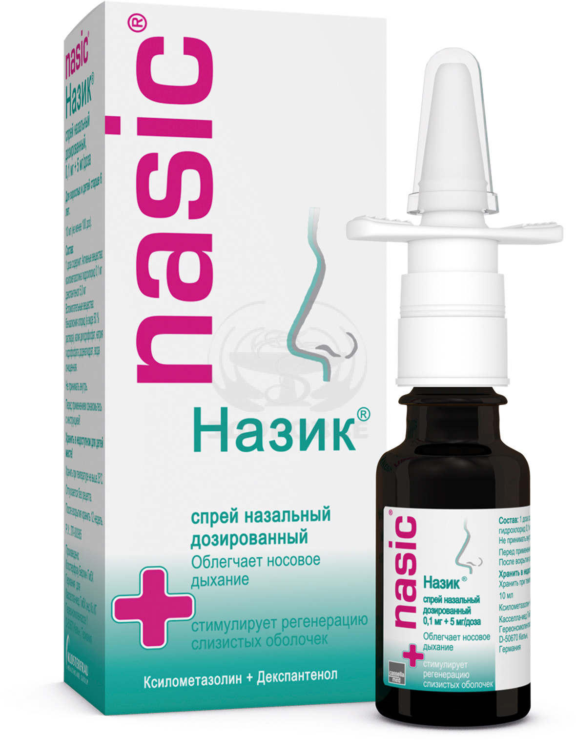 Назальный спрей Назик - комбинированный назальный препарат для местного применения, содержащий Ксилометазолин и Декспантенол. Ксилометазолин относится к группе местных сосудосуживающих средств (деконгестантов) с альфа- адреномиметической активностью, вызывает сужение кровеносных сосудов слизистой оболочки полости носа, восстанавливает проходимость носовых ходов, облегчает носовое дыхание. Действие препарата обычно наступает через несколько минут после его применения и продолжается до 10 часов. Декспантенол - витамин группы В - производное пантотеновой кислоты. Декспантенол превращается в организме в пантотеновую кислоту, являющуюся составной частью коэнзима А и участвует в процессах ацетилирования, углеводном и жировом обмене, в синтезе ацетилхолина, кортикостероидов, порфиринов, стимулирует регенерацию кожи, слизистых оболочек, нормализует клеточный метаболизм, ускоряет митоз и увеличивает прочность коллагеновых волокон. Оказывает регенерирующее, метаболическое и слабое противовоспалительное действие.