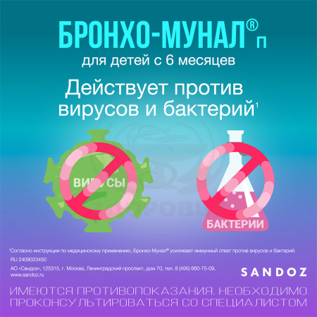 Серьезная опасность ОРВИ* – быстрое размножение вирусов, их способность мгновенно передаваться от человека человеку, и возможные бактериальные осложнения такие, как бронхиты, гаймориты, отиты. Важно блокировать размножение вирусов в организме и не затягивать простудное заболевание.Бронхо-Мунал® с первых дней применения в комплексном лечении ОРИ1 помогает организму бороться с вирусами – причиной простуды2. В отличие от противовирусных препаратов Бронхо-Мунал® помогает бороться и с бактериями – причиной осложнений ОРВИ2.Бронхо-Мунал® снижает риск развития осложнений3,4 и потребность в антибиотиках2. Препарат можно применять на любой стадии заболевания ОРВИ**1.Бронхо-Мунал® усиливает иммунитет и применяется с целью профилактики рецидивирующих инфекций дыхательных путей и обострения хронического бронхита2Бронхо-Мунал® (7 мг) применяется у детей с 12 лет и взрослых. По 1 капсуле за 30 минут до еды 1 раз в день2.В комплексном лечении респираторных инфекций – до исчезновения симптомов, но не менее 10 дней2.Для профилактики рецидивирующих ОРИ - тремя курсами по 10 дней с интервалом между курсами 20 дней2* ОРВИ — острые респираторные вирусные инфекции.**в составе комплексной терапии острых инфекций дыхательных путей1. Геппе Н.А., Малахов А.Б. и драже Согласованное мнение экспертов IX Образовательного международного консенсуса по респираторной медицине в педиатрии по вопросам применения бактериальных лизатов в педиатрической практике // Доктор.РУ. Педиатрия. - Том 19, №3. – 20202. Согласно инструкции по медицинскому применению препарата Бронхо-Мунал® (РУ П N011632/01)3. По данным исследования Jara-Perez J.V. et al. // Clinical Therapeutics, 2000. Vol. 22. P. 748-7594. Сорокман Т. В. и драже //Актуальная инфектология. – 2020. – Т. 8. – №. 2.