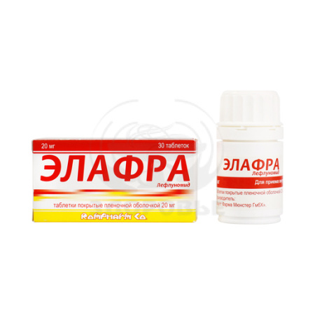 Элафра может назначаться пациентам только после тщательного медицинского обследования.;Перед началом лечения препаратом Элафра необходимо помнить о возможном увеличении числа побочных эффектов у пациентов, ранее получавших другие базисные средства для лечения ревматоидного артрита, которые обладают гепато- и гематотоксическими действиями.;Активный метаболит лефлуномида - А771726 - характеризуется длительным Т1/2, обычно составляющим 1-4 недели, вследствие чего даже при прекращении лечения лефлуномидом могут возникнуть или сохраняться серьезные нежелательные эффекты (например, гепатотоксичность, гематоксичность или аллергические реакции). В этом случае следует проводить процедуру "отмывания" (после прекращения лечения лефлуномидом назначают колестирамин в дозе 8 г 3 раза/сут в течение 11 дней или 50 г активированного угля, измельченного в порошок, 4 раза/сут в течение 11 дней). Процедуру можно повторить по клиническим показаниям.;При подозрении на тяжелые иммунологические/аллергические реакции типа синдрома Стивенса-Джонсона или синдрома Лайелла проведение полной процедуры "отмывания" обязательно.;При возникновении подобных случаев токсичности или при переходе к приему другого базисного препарата (например, метотрексата) после лечения лефлуномидом необходимо проводить процедуру "отмывания".;Поскольку активный метаболит лефлуномида, А771726, связывается с белками и выводится посредством печеночного метаболизма и секреции желчи, предполагается, что уровень содержания А771726 в плазме крови может повышаться у больных с гипопротеинемией.;Сообщалось о редких случаях развития тяжелого поражения печени, в отдельных случаях со смертельным исходом, при лечении лефлуномидом. Большинство этих случаев наблюдалось в течение первых 6 мес лечения. Хотя не установлена причинная взаимосвязь этих нежелательных явлений с лефлуномидом, и в большинстве случаев имелось несколько дополнительных подозрительных факторов, точное выполнение рекомендаций контроля лечения считается обязательным.;Уровень АЛТ следует проверять перед началом терапии лефлуномидом, а затем каждые 2 недели в течение первых 6 мес лечения, с последующей проверкой 1 раз в 6-8 недель.;Имеются следующие рекомендации по коррекции режима дозирования или прекращению приема препарата в зависимости от выраженности и стойкости повышения уровня АЛТ. При подтвержденном 2-3-кратном превышении ВГН снижение дозы с 20 мг/сут до 10 мг/сут может позволить продолжить прием лефлуномида при условии тщательного контроля этого показателя. Если 2-3-кратное превышение ВГН АЛТ сохраняется или если имеется подтвержденный подъем уровня АЛТ, превышающий ВГН более чем в 3 раза, прием лефлуномида следует прекратить и начать процедуру "отмывания".;Из-за возможных дополнительных гепатотоксических эффектов рекомендуется воздержаться от приема алкоголя при лечении лефлуномидом.;Полный клинический анализ крови, включая определение лейкоцитарной формулы и количества тромбоцитов, следует проводить до начала лечения лефлуномидом, а также каждые 2 недели в течение первых 6 мес лечения и затем каждые 6-8 недель.;У пациентов с ранее имевшей место анемией, лейкопенией и/или тромбоцитопенией, а также у пациентов с нарушениями функции костного мозга или с риском развития таких нарушений, возрастает опасно