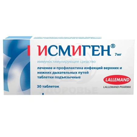 Комбинированный иммуностимулирующий препарат бактериального происхождения для сублингвального (подъязычного) приема. Представляет собой поливалентный антигенный комплекс, включающий лизаты бактерий - наиболее часто встречающихся возбудителей респираторных инфекций. Лизаты, входящие в состав Исмигена, получены путем механического воздействия. Исмиген, как и другие иммуностимуляторы бактериального происхождения второго поколения, оказывает неспецифическое иммуностимулирующее и специфическое вакцинирующее действие.Исмиген таблетки подъязычные оказывает действие на различные звенья иммунитета. Стимулирует как местный клеточный и гуморальный иммунный ответ, так и системный иммунный ответ. Активирует фагоцитоз, увеличивает содержание лизоцима в слюне, способствует увеличению количества иммунокомпетентных клеток.Повышает функциональную и метаболическую активность макрофагов (в т.ч. альвеолярных) и полиморфноядерных лейкоцитов. Активирует процессы перекисного окисления и экспрессию молекул адгезии на макрофагально-моноцитарных клетках и гранулоцитах LEA-1, MAC-1, p-150, ICAT-1, что обеспечивает кооперацию с Т-лимфоцитами и антигенпрезентирующими клетками и способствует уничтожению инфекционных агентов. Стимулирует секрецию макрофагально-моноцитарными клетками простагландина Е2, активирует естественные киллеры; стимулирует высвобождение противовоспалительных цитокинов - интерлейкина ИЛ-1, ИЛ-2, ИЛ-6, ИЛ-8, гамма-интерферона, фактора некроза опухоли альфа; угнетает синтез ИЛ-4, ИЛ-12; повышает концентрацию секреторного иммуноглобулина IgA в слюне, сывороточных IgA, IgG, IgM; уменьшает концентрацию сывороточного IgE.В результате лечения Исмигеном сокращается частота, выраженность и длительность острых инфекций респираторного тракта; наблюдается облегчение и нивелирование таких симптомов как лихорадка, кашель, одышка, уменьшается потребность в антибактериальной и противовоспалительной терапии; у пациентов с хроническими заболеваниями респираторного тракта препарат также предупреждает обострения.