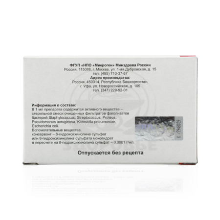 1 флакон содержит:Смесь очищенных фильтратов фаголизатов бактерий Staphylococcus, Streptococcus, Proteus, Pseudomonas aeruginosa, Klebsiella pneumoniae, Escherichia coli 20 мл.Консервант: 8-гидроксихинолина сульфат - 0.0001 г/мл (содержание расчетное) или 8-гидроксихинолина сульфата моногидрат - 0.0001 г/мл (в пересчете на гидроксихинолина сульфат, содержание расчетное).