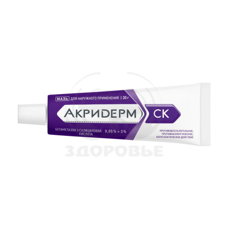 Мазь Акридерм; СК применяют для терапии подострых и хронических дерматозов, чувствительных к наружной кортикостероидной терапии, сопровождающихся гиперкератозом:— псориаз;— атопический дерматит (нейродермит);— красный плоский лишай;— экзема;— дисгидратический дерматит;— ихтиоз и ихтиозоформные изменения.