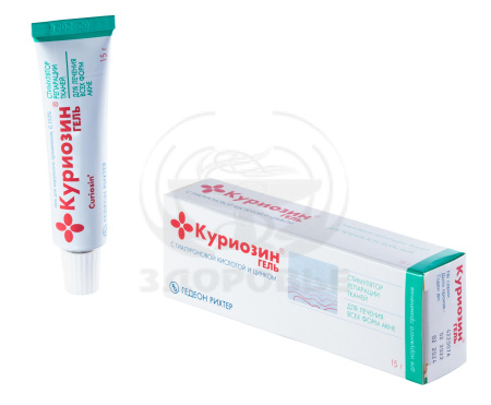 Гиалуроновая кислота - биополимер мукополисахаридного типа - является важным элементом межклеточного вещества. Благодаря своим биохимическим свойствам способна взаимодействовать с другими молекулами (например белки, вода), что играет важную роль в осуществлении специфических биологических процессов. Вследствие выраженной гидрофильности образует дисперсионный внеклеточный матрикс с молекулами воды, что имеет важное значение для эластичности и тонуса кожи. Гиалуроновая кислота улучшает микроциркуляцию и ускоряет регенерацию тканей. В процессе тканевой регенерации повышается местная концентрация гиалуроновой кислоты, что создает оптимальные условия для активизации, миграции и пролиферации клеток, участвующих в данном процессе. При нарушении целостности кожных покровов применение препарата приводит к усилению клеточной пролиферации и ускорению заживления тканей. В препарате Куриозин гиалуроновая кислота находится в форме гиалуроната цинка, который оказывает противомикробное действие. Помимо 2 важнейших факторов, играющих роль в патомеханизме угрей (гиперплазия сальной железы и гиперкератинизация выводящего протока фолликула), важное значение имеют биологически активные вещества, образующиеся и освобождающиеся под действием Propionibacterium acnes. В результате указанных патологических изменений нарушается баланс и снижается концентрация гиалуроновой кислоты в тканях. Компенсирование повышенной потребности в гиалуроновой кислоте в тканях становится возможным при помощи местного применения геля Куриозин. Цинк тормозит липазную активность Propionibacterium acnes.