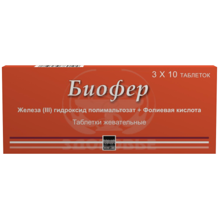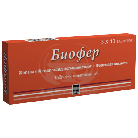 Антианемический препарат. Препарат Биофер содержит железо в виде полимальтозного комплекса гидроокиси железа (III). Данный макромолекулярный комплекс стабилен и не выделяет железо в виде свободных ионов в ЖКТ. Структура Биофера сходна с естественным соединением железа ферритина. Благодаря такому сходству, железо (III) поступает из кишечника в кровь путем активного транспорта. Именно это свойство объясняет невозможность передозировки препарата в отличие от простых солей железа, всасывание которых происходит по градиенту концентрации. Всосавшееся железо связывается с ферритином и сохраняется в организме, преимущественно в печени. Затем, в костном мозге оно включается в состав гемоглобина. Железо, входящее в состав полимальтозного комплекса гидрооксида железа (III), не обладает прооксидантными свойствами, в отличие от простых солей железа. Существует корреляция между выраженностью дефицита железа и уровнем его всасывания (чем больше выраженность дефицита железа, тем лучше всасывание). Наиболее активный процесс всасывания происходит в двенадцатиперстной и тонкой кишке. Фолиевая кислота – витамин группы В, стимулирует эритропоэз, участвует в синтезе аминокислот, нуклеиновых кислот, пуринов, пиримидинов, в обмене холина. Прием препарата Биофер в лекарственной форме таблетки жевательные не вызывает окрашивания эмали зубов.