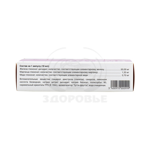 Действующее вещество: Железа глюконат + Марганца глюконат + Меди глюконат (Ferrous gluconate + Manganese gluconate + Cuprum gluconate)Концентрация действующего вещества (мг): Железа глюконата дигидрат (количество, соответствующее элементарному железу) 50 мг, марганца глюконат (количество, соответствующее элементарному марганцу) 1, 33 мг, меди глюконат (количество, соответствующее элементарной меди) 0,7 мг