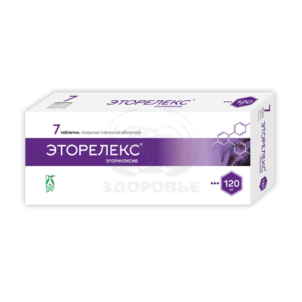 Абсорбция Эторикоксиб быстро всасывается при приеме внутрь. Абсолютная биодоступность при приеме внутрь составляет около 100%. После приема препарата взрослыми натощак в дозе 120 мг 1 раз/сут максимальная концентрация (Сmax) составляет 3.6 мкг/мл, время достижения Сmax – 1 ч после приема. Средняя геометрическая AUC0-24ч – 37.8 мкг×ч/мл. Фармакокинетика эторикоксиба в пределах терапевтических доз носит линейный характер. При приеме эторикоксиба в дозе 120 мг во время еды (еда с высоким содержанием жиров) не наблюдалось клинически значимого влияния на степень абсорбции. Скорость абсорбции изменялась, что приводило к снижению Сmax на 36% и увеличению ТСmax на 2 ч. Данные результаты не считаются клинически значимыми. В клинических исследованиях эторикоксиб применялся независимо от приема пищи. Распределение Эторикоксиб приблизительно на 92% связывается с белками плазмы крови у человека при концентрациях 0,05-5 мкг/мл. Объем распределения (Vdss) в равновесном состоянии составляет около 120 л. Эторикоксиб проникает через плацентарный барьер и гематоэнцефалический барьер. Метаболизм Эторикоксиб интенсивно метаболизируется. Менее 1% эторикоксиба выводится почками в неизмененном виде. Основной путь метаболизма – образование 6'-гидроксиметилэторикоксиба, катализируемое ферментами системы цитохромов. CYP3A4 способствует метаболизму эторикоксиба in vivo. Исследования in vitro указывают, что изоферменты CYP2D6, CYP2C9, CYP1A2 и CYP2C19 также могут катализировать основной путь метаболизма, но их количественное воздействие in vivo не изучалось. У человека обнаружено 5 метаболитов эторикоксиба. Основным метаболитом является 6'-карбоксиацетилэторикоксиб, образующийся при дополнительном окислении 6'-гидроксиметилэторикоксиба. Эти основные метаболиты не обладают заметной активностью, либо являются слабыми ингибиторами ЦОГ-2. Ни один из этих метаболитов не ингибирует ЦОГ-1. Выведение При однократном в/в введении здоровым добровольцам меченого радиоактивного эторикоксиба в дозе 25 мг 70% эторикоксиба выводилось почками, 20% – через кишечник, преимущественно в виде метаболитов. Менее 2% обнаруживалось в неизмененном виде. Выведение эторикоксиба происходит в основном путем метаболизма с последующим выведением почками. Равновесная концентрация достигается при ежедневном приеме 120 мг эторикоксиба через 7 сут с коэффициентом кумуляции около 2, что соответствует периоду полувыведения около 22 ч. Плазменный клиренс после в/в введения 25 мг составляет приблизительно 50 мл/мин. Особые группы пациентов Пожилые Фармакокинетика у пациентов пожилого возраста (65 лет и старше) сопоставима с фармакокинетикой у молодых. Пол Фармакокинетика эторикоксиба сходна у мужчин и женщин. Печеночная недостаточность У пациентов с нарушениями функции печени легкой степени тяжести (5-6 баллов по шкале Чайлд-Пью) прием эторикоксиба в дозе 60 мг 1 раз/сут сопровождался увеличением показателя AUC на 16% по сравнению со здоровыми лицами, принимавшими препарат в той же дозе. У пациентов с нарушениями функции печени средней степени тяжести (7-9 баллов по шкале Чайлд-Пью), принимавших эторикоксиб в дозе 60 мг через день, среднее значение AUC было таким же, как у здоровых лиц, принимавших эторикоксиб ежедневно в той же дозе. Эторикоксиб в дозе 30 мг 1 раз/сут не изучался в данной популяции. Данные клинических и фармакокинетически