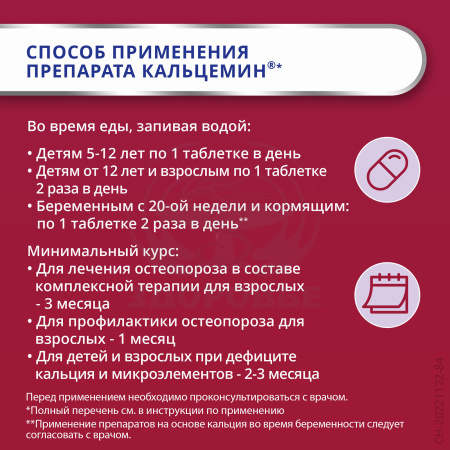 Внутрь.Детям от 5 до 12 лет принимать по 1 таблетке 1 раз в день во время еды.Взрослым и детям старше 12 лет - по 1 таблетке 2 раза в день во время еды.В период беременности и грудного вскармливания: с 20-й недели беременности и весь период грудного вскармливания - по 1 таблетке 2 раза в день.Минимальный курс приема препарата для лечения остеопороза в составе комплексной терапии для взрослых составляет 3 месяца, более продолжительный курс - после консультации с врачом.Минимальный курс приема препарата для профилактики остеопороза для взрослых составляет 1 месяц, более продолжительный курс - после консультации с врачом.Минимальный курс приема препарата для детей и взрослых при дефиците кальция и микроэлементов составляет 2-3 месяца, более продолжительный курс - после консультации с врачом.Повторный курс приема препарата возможен через 1 месяц после окончания лечения.