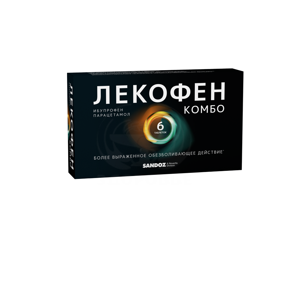 Анальгезирующее средство комбинированное (НПВП + анальгезирующее ненаркотическое средство).Комбинированный препарат действие которого обусловлено входящими в его состав компонентами. Оказывает направленное действие против боли (обезболивающее) жаропонижающее и противовоспалительное действие. Ибупрофен и парацетамол отличаются по механизму и месту действия. В результате их взаимоусиливающего действия достигается более выраженное снижение болевой чувствительности и усиление жаропонижающего действия чем по отдельности.Ибупрофен – производное пропионовой кислоты из группы нестероидных противовоспалительных препаратов (НПВП) оказывает противовоспалительное в том числе противоотечное анальгетическое и жаропонижающее действие. Механизм действия ибупрофена обусловлен ингибированием синтеза простагландинов – медиаторов боли воспаления и гипертермической реакции посредством неизбирательного угнетения активности циклооксигеназы 1 (ЦОГ-1) и циклооксигеназы 2 (ЦОГ-2). Обезболивающий эффект ибупрофена обеспечивается его ингибирующим действием на периферическом уровне. Антипиретический эффект ибупрофена связан с центральным ингибированием синтеза простагландинов в гипоталамусе. Ибупрофен ингибирует миграцию лейкоцитов в очаг воспаления. Кроме того ибупрофен обратимо подавляет агрегацию тромбоцитов.Парацетамол – анальгезирующее ненаркотическое средство обладает обезболивающим жаропонижающим и слабым противовоспалительным действием. Неизбирательно блокирует ЦОГ-2 преимущественно в центральной нервной системе. Парацетамол также может стимулировать активность нисходящих путей серотонина что приводит к купированию передачи болевого импульса в спинном мозге. На периферическом уровне парацетамол обладает слабовыраженным действием на ЦОГ-1 и ЦОГ-2.Препарат Лекофен Комбо оказывает более быстрый терапевтический эффект и более выраженное обезболивающее действие (лучше уменьшает боль) чем ибупрофен и парацетамол по отдельности. После приема одной таблетки обезболивающий эффект отмечается в среднем через 15 минут после приема препарата клинически значимый обезболивающий эффект достигается через 40 минут и сохраняется в течение 8 часов. После приема двух таблеток обезболивающий эффект отмечается в среднем через 18 минут после приема препарата клинически значимый обезболивающий эффект достигается через 45 минут и сохраняется в течение 9 часов.