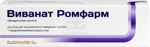 Остеопороз может быть подтвержден при выявлении низкой МПК (Т индекс < -2 SD [Standard deviation - стандартное отклонение]) перелома (в т.ч. в анамнезе) или низкой минеральной плотности костной ткани (Т индекс <- 25 SD) при отсутствии подтвержденного перелома.ГипокалъциемияДо начала применения препарата Виванат Ромфарм следует скорригировать гипокальциемию и другие нарушения метаболизма костной ткани и электролитного баланса. Пациентам следует употреблять достаточное количество кальция и витамина D. Если пациент получает с пищей недостаточно кальция и витамина D то следует дополнительно принимать их в виде пищевых добавок.Анафилактические реакцииВо время в/в ведения препарата следует проводить мониторинг состояния пациента а также обеспечить доступность соответствующей медицинской помощи. При выявлении анафилактической или другой тяжелой реакции гиперчувствительности/аллергической реакции необходимо немедленно прервать инфузию и начать соответствующее лечение.Пациенты с сердечной недостаточностьюСледует избегать избыточной гидратации у пациентов с риском развития сердечной недостаточности.Пациенты с почечной недостаточностьюПеред каждой инъекцией следует определять содержание креатинина в сыворотке крови. Пациенты с сопутствующими заболеваниями получающие нефротоксичную терапию у которых возможно ухудшение функции почек должны находиться под тщательным наблюдением.Остеонекроз челюстиПри применении бисфосфонатов у пациентов с онкологическими заболеваниями наблюдался остеонекроз челюсти наиболее часто ассоциированный с удалением зуба и/или локальной инфекцией (в частности остеомиелитом). Остеонекроз челюсти развивался главным образом на фоне в/в применения бисфосфонатов которое часто сопровождалось химиотерапией и применением ГКС.Остеонекроз челюсти также отмечался на фоне приема пероральных форм бисфосфонатов для лечения остеопороза.При наличии таких сопутствующих факторов риска как онкологическое заболевание лучевая или химиотерапия (включая ингибиторы ангиогенеза) прием ГКС а также недостаточная гигиена полости рта рекомендовано проведение стоматологического осмотра и соответствующего профилактического лечения перед назначением бисфосфонатов.Во время лечения бисфосфонатами необходимо избегать инвазивных стоматологических процедур.Хирургическое стоматологическое вмешательство на фоне терапии бисфосфонатами может усилить проявления остеонекроза челюсти. Неизвестно снижает ли риск возникновения остеонекроза отмена бисфосфонатов. Решение о проведении лечения следует принимать для каждого пациента индивидуально после оценки соотношения риск/польза.У пациентов получающих терапию бисфосфонатами включая ибандроновую кислоту отмечались случаи развития остеонекроза других челюстно-лицевых областей в том числе наружного слухового канала. Дополнительные факторы риска могут включать повторяющиеся мелкие травмы (например регулярное использование ватных палочек). Факторы риска развития остеонекроза наружного слухового канала совпадали с таковыми при остеонекрозе челюсти. Пациентов получающих бисфосфонаты и имеющих нарушения со стороны органа слуха включая хронические ушные инфекции следует мониторировать на предмет развития остеонекроза.Атипичные переломы бедраАтипичны