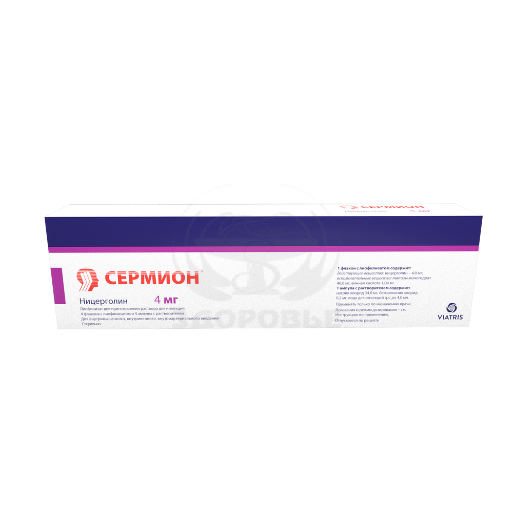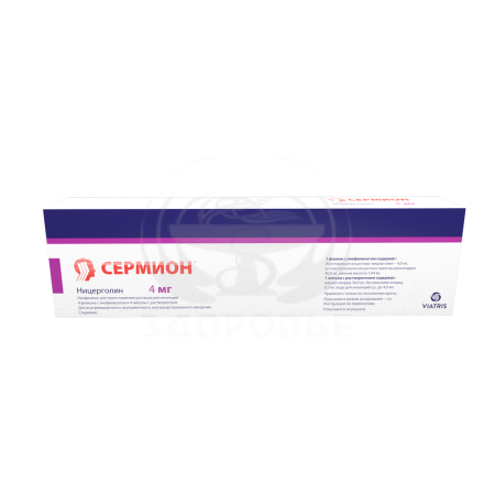 Таблетки 5 мг, 10 мг и 30 мгНазначают внутрь в дозе 5-10 мг 3 раза/сут с одинаковыми интервалами между приемами в течение длительного периода времени (до нескольких месяцев). При сосудистой деменции показано применение по 30 мг 2 раза/сут. При этом каждые 6 месяцев рекомендуется консультация врача по поводу целесообразности продолжения терапии. Лиофилизат для приготовления раствора для инъекцийВ/м: по 2-4 мг (2-4 мл) 2 раза/сут. В/в: медленная инфузия в дозе 4-8 мг в 100 мл 0. 9% раствора натрия хлорида или 5-10% раствора декстрозы. Препарат в этой дозе можно вводить несколько раз в день. Внутриартериально: 4 мг в 10 мл 0. 9% раствора натрия хлорида; препарат вводят в течение 2 мин. Восстановленный раствор рекомендуется использовать сразу после приготовления. Доза, длительность терапии и способ введения зависят от характера заболевания. В некоторых случаях предпочтительно начать терапию с парентерального введения, а затем перейти на прием препарата внутрь для поддерживающего лечения. У пациентов с нарушением функции почек (содержание сывороточного креатинина >2 мг/дл) Сермион рекомендуется применять в более низких терапевтических дозах.