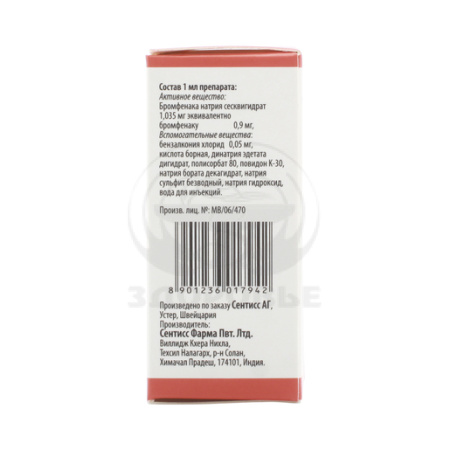 На 1 мл: бромфенака натрия сесквигидрат 0.9 мг, что соответствует содержанию бромфенака 1.035 мгВспомогательные вещества: бензалкония хлорид - 0.05 мг, борная кислота - 11 мг, динатрия эдетата дигидрат - 0.2 мг, полисорбат 80 - 1.5 мг, повидон К-30 - 20 мг, натрия бората декагидрат - 11 мг, натрия сульфит безводный - 2 мг, натрия гидроксид - до pH 8.3, вода для и - до 1 мл.