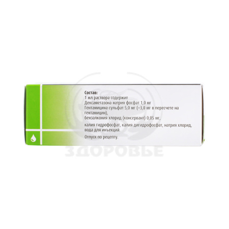 На 1 мл: дексаметазона натрия фосфат 1 мг, гентамицина сульфат 5 мг, что соответствует содержанию гентамицина 3 мг. Вспомогательные вещества: бензалкония хлорид (консервант) - 0.05 мг, калия гидрофосфат - 1.88 мг, калия дигидрофосфат - 5.86 мг, натрия хлорид - 5 мг, вода д/и - до 1 мл.