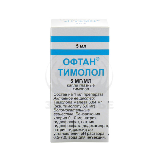 В 1 мл содержится тимолола малеат (в пересчете на тимолол) 5,0 мг, вспомогательные вещества: бензалкония хлорид — 0,1 мг; натрия фосфат однозамещенный 2-водный; натрия фосфат двузамещенный 12-водный; натрия гидроксид; вода для инъекций;