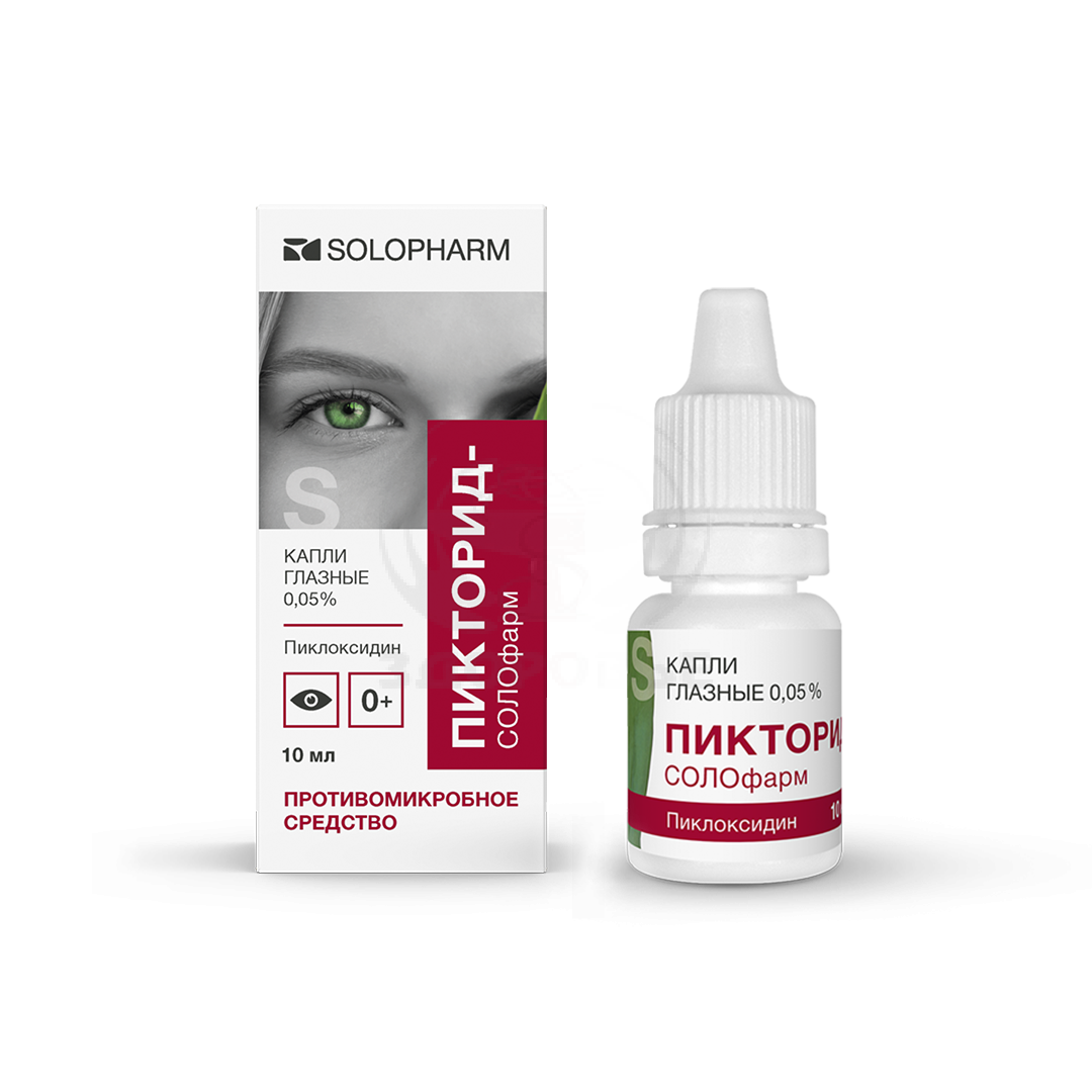 Для предотвращения загрязнения раствора препарата при закапывании пациентам следует избегать контакта наконечника открытого флакона с глазом и кожей.Для предотвращения попадания препарата в системный кровоток через слизистую оболочку носа рекомендуется надавить пальцами на внутренний угол глаза на 2 минуты после закапывания.В случае использования нескольких местных офтальмологических препаратов перерыв между закапываниями должен составлять не менее 15 минут. Нельзя использовать для субконъюнктивальных инъекций или для введения в переднюю камеру глаза. Глазные капли Пикторид-СОЛОфарм не изменяют цвет контактных линз (включая мягкие гидрофильные), однако при инфекционных заболеваниях ношение контактных линз противопоказано.Влияние на способность управления транспортными средствами и механизмамиПосле закапывания возможно временное затуманивание зрения, которое может повлиять на способность управлять автомобилем или работать с техникой. Если после закапывания проявляются подобные симптомы, пациент должен подождать до восстановления четкости зрения перед тем, как управлять автомобилем или работать с техникой.