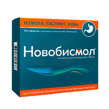 Внутрь, за 30 мин до еды.Взрослые и дети старше 12 лет - по 1 табл. 3 раза в сутки и 1 табл. на ночь или по 2 табл. 2 раза в сутки.Дети от 8 до 12 лет - по 1 табл. 2 раза в сутки.Дети от 4 до 8 лет - в дозе 8 мг/кг/сут; суточную дозу разделяют на 2 приема.Таблетки следует запивать небольшим количеством воды. Продолжительность курса лечения 4–8 нед. В течение следующих 8 нед не следует применять препараты, содержащие висмут. Для эрадикации Helicobacter pylori целесообразно применение висмута трикалия дицитрата в комбинации с другими антибактериальными средствами, обладающими антихеликобактерной активностью.Препарат не следует применять более 8 нед. Не рекомендуется во время лечения препаратом Новобисмол превышать установленные суточные дозы для взрослых и детей.В период лечения не следует применять другие препараты, содержащие висмут.По окончании курсового лечения препаратом в рекомендуемых дозах концентрация активного действующего вещества в плазме крови не превышает 3–5,8 мкг/л, а интоксикация наблюдается лишь при концентрации выше 100 мкг/л.При применении препарата Новобисмол возможно окрашивание кала в темный цвет вследствие образования сульфида висмута. Иногда отмечается незначительное потемнение языка.
