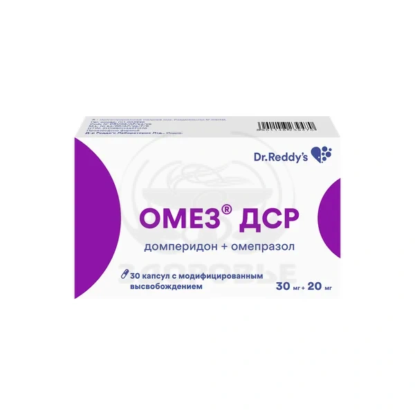 Омез ДСР - противоязвенный препарат, обладающий сочетанием действием двух активных компонентов. Комбинация двух действующих веществ (домперидон и омепразол) оказывает комплексное действие на основные звенья патогенеза гастроэзофагеальной рефлюксной болезни (ГЭРБ), диспепсические нарушения различного генеза.