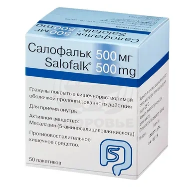 ВсасываниеВысвобождение месалазина происходит в терминальном отделе тонкой и толстой кишки. Таблетки начинают растворяться в тонкой кишке через 110-170 мин и полностью растворяются через 165-225 мин после приема. На скорость растворения не влияют изменения рН среды, вызванные приемом пищи или других препаратов.Освобождение месалазина из гранул начинается с замедлением в 2-3 ч, Cmax в плазме достигается примерно через 4-5 ч.Системная биодоступность месалазина после перорального приема составляет приблизительно 15-25%. Прием пищи замедляем абсорбцию на 1-2 ч, но не изменяет скорость и степень абсорбции.Прием пищи может замедлить транзит препарата на 1-2 ч, при этом возрастают значения Tlag (разрыв времени после которого содержание месалазина впервые определяется в крови) и Tmax, однако в связи с малым размером гранул это не изменяет скорость и степень абсорбции.Прием пищи вызывает небольшое увеличение значений Cmax и AUC.Общее количество месалазина и N-ацетил-5-АСК выводимое почками в течение 24 ч, эквивалентно примерно 25-32% соответственно назначенной дозы гранул и таблеток Салофальк. Примерно 30% этого количества всасывается в илеоцекальной зоне, а примерно 90% в целом в илеоцекальной зоне и восходящей толстой кишке. Таким образом, примерно 80-90% 5-АСК назначенной дозы присутствует в нисходящей толстой кишке, сигмовидной и прямой кишках, где скорость их всасывания низка.РаспределениеБлагодаря размеру гранул (около 1 мм), транзит из желудка до тонкой кишки происходит быстро. Комбинированное фармакосцинтиграфическое и фармакокинетическое исследование показало, что препарат достигает илеоцекального отдела примерно через 3 ч, а восходящего отдела толстой кишки - приблизительно через 4 ч. Общее время транзита по толстой кишке составляет около 20 ч. Примерно 80% от принятой пероральной дозы достигает толстой, сигмовидной и прямой кишки.МетаболизмМесалазин метаболизируется как пресистемным путем в слизистой оболочке кишечника, так и системным путем в печени, превращаясь в фармакологически неактивную N-ацетил-5-аминосалициловую кислоту (N-Ац-5-АСК). Характер ацетилирования не зависит от ацетилирующего фенотипа больного. В небольшой степени ацетилирование может осуществляться за счет действия бактериальной микрофлоры толстой кишки. Связь с белками плазмы месалазина и N-Aц-5-АСК составляет соответственно 43% и 78%. В материнское молоко проникает (в виде метаболита) 0.1% дозы.ВыведениеПри приеме месалазина в дозе 500 мг 3 раза/сут общая элиминация почками месалазина и N-Aц-5-АСК в условиях насыщающей концентрации составила около 25%. Экскреция неметаболизированной части месалазина составила менее 1% от перорально принятой дозы. T1/2 в этом исследовании оказался равным 4.4 ч.Фармакокинетика в особых клинических случаяхПри однократном пероральном назначении гранул Салофальк в дозе 20 мг/кг 13 детям с активным воспалительным заболеванием толстого кишечника (возраст от 5.9 до 15.8 лет) фармакокинетика системной экспозиции препарата соответствовала таковой у взрослых. Салофальк был безопасен и хорошо переносился.Данные о фармакокинетике Салофалька у пожилых при его применении, как в таблетках, так и в гранулах отсутствуют.