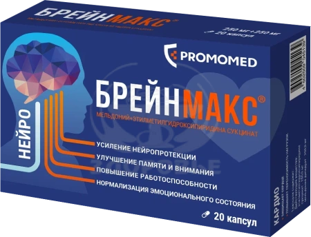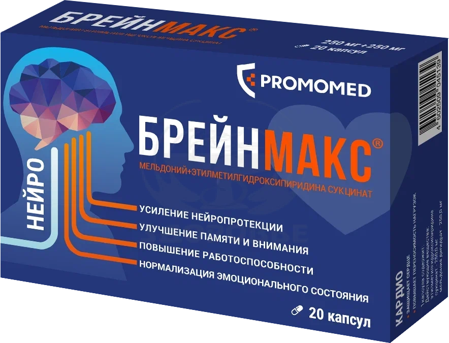 Совместное применение мельдония и этилметилгидроксипиридина сукцината приводит к синергическому фармакодинамическому взаимодействию двух компонентов, что повышает нейропротекторную активность препарата. При применении комбинированного лекарственного препарата БРЕЙНМАКС® оказываемый противогипоксический, антиоксидантный, ноотропный и противоишемический эффект двух действующих веществ превосходит фармакологический эффект каждого из компонентов, применяемых в отдельности, что приводит к уменьшению клинических проявлений цереброваскулярной недостаточности, улучшению когнитивных функций, улучшению памяти и внимания, нормализации эмоционального состояния, уменьшению симптомов психического и физического перенапряжения, повышению работоспособности, увеличению толерантности к умственным и физическим нагрузкам. В клинических исследованиях показано, что препарат БРЕЙНМАКС® по сравнению с монокомпонентами (мельдонием и этилметилгидроксипиридина сукцинатом) оказывает более выраженное положительное влияние на состояние пациентов с ишемическим инсультом в раннем восстановительном периоде, повышая уровень дееспособности и мобильности пациентов, значительно уменьшая выраженность когнитивных нарушений и улучшая неврологический статус.