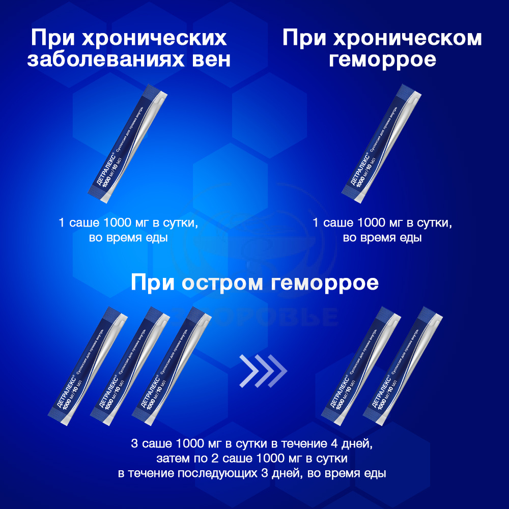 Рекомендуемая доза при хроническом геморрое - 1000 мг (содержимое 1 саше)/сут в любое удобное время дня вместе с приемом пищи.