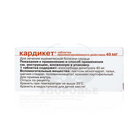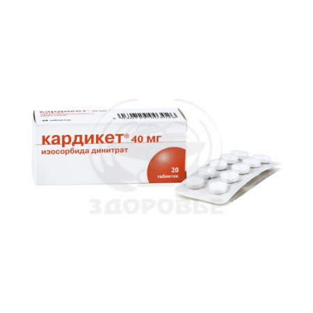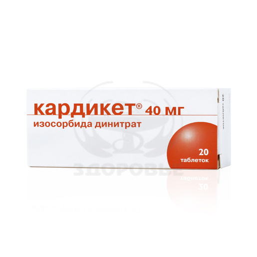Изосорбида динитрат 40 мг. Вспомогательные вещества: лактозы моногидрат, тальк, магния стеарат, поливинилацетат, крахмал картофельный.